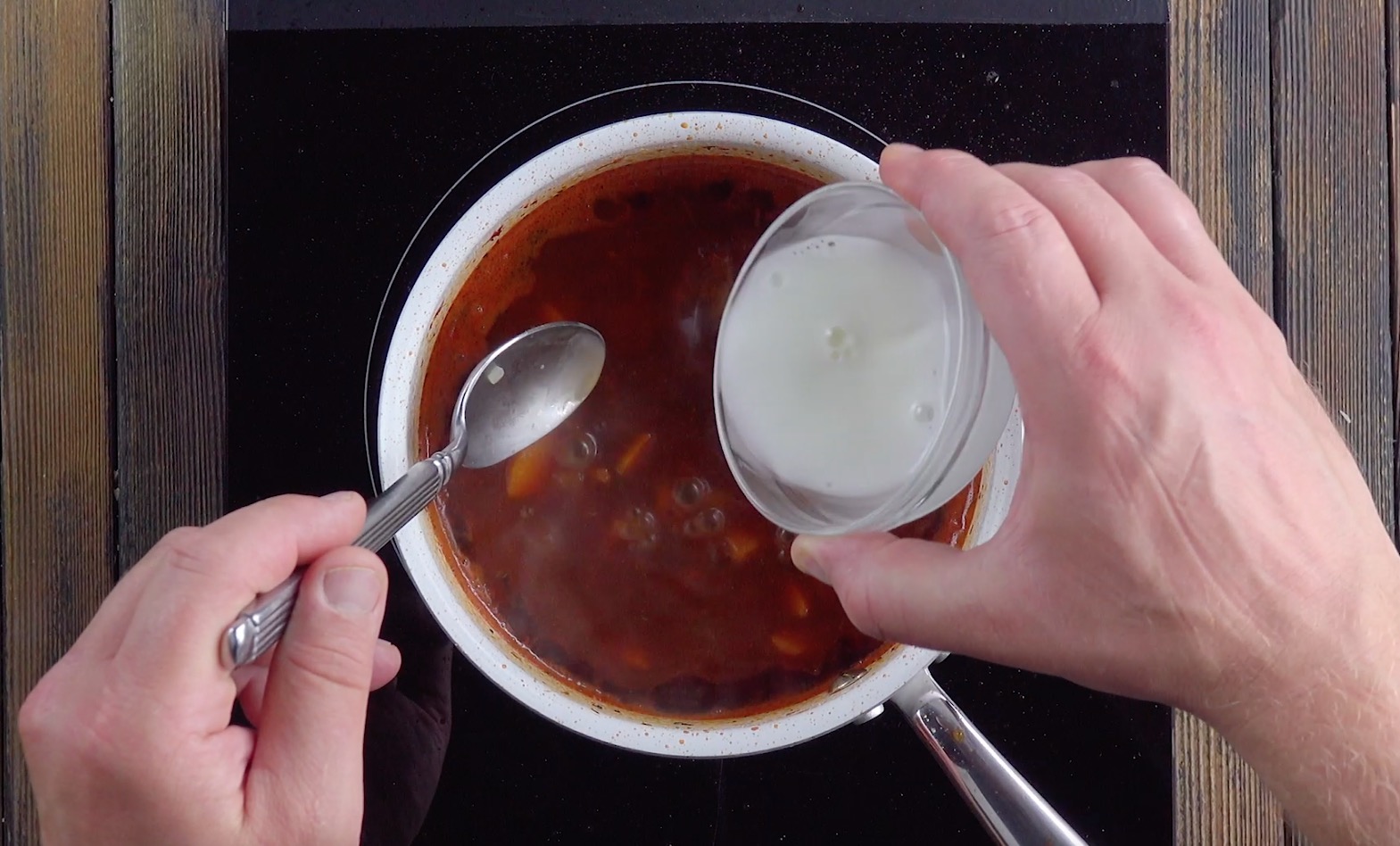 Rühre die Maisstärke in etwas Wasser ein und gieße dies zum Abbinden ebenfalls in die Soße. Lass nun noch einmal alles zusammen aufkochen.