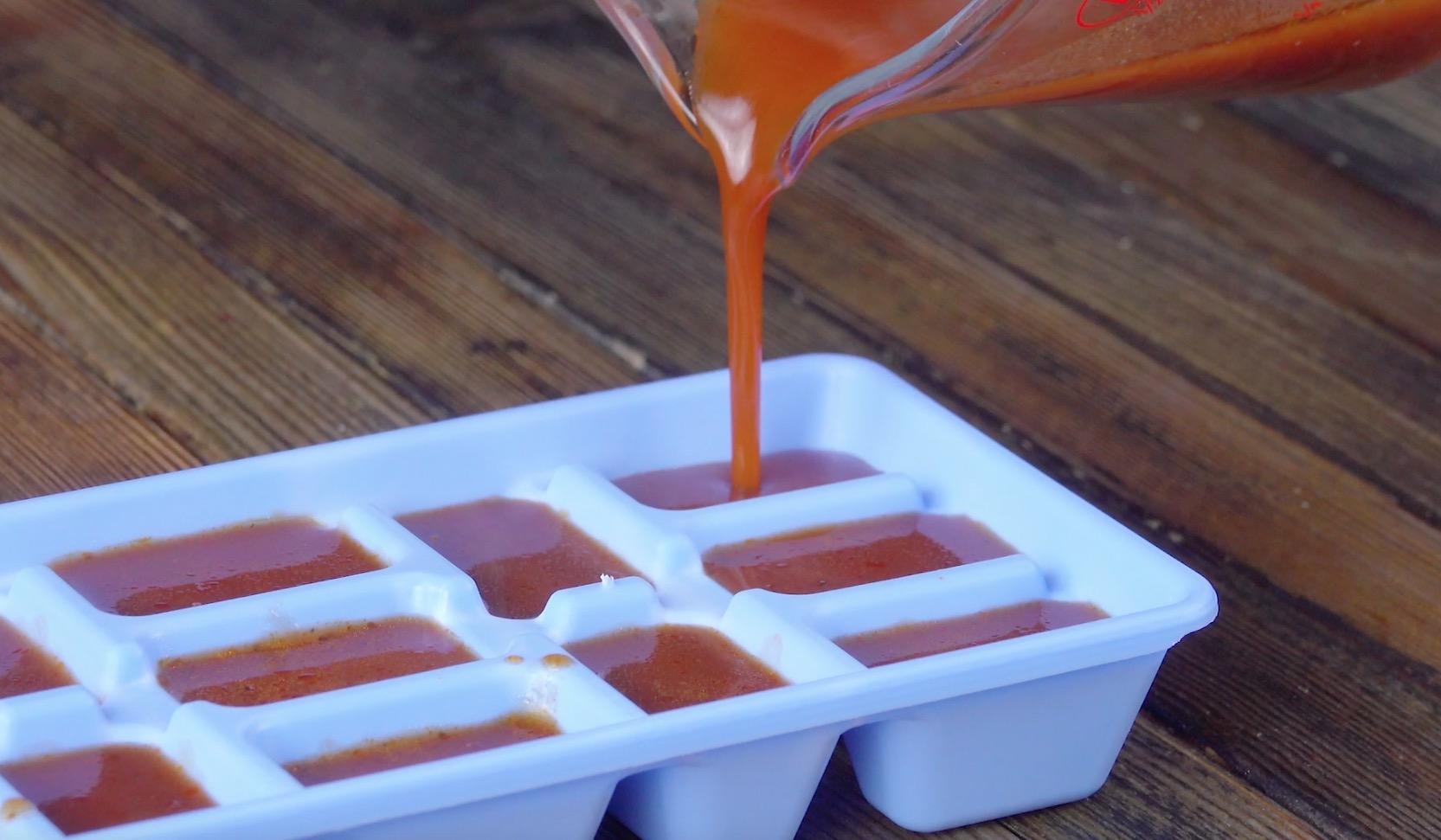 2.) Gieße die Soße nun durch ein Sieb ab und verteile die Flüssigkeit dann in die Vertiefungen einer Eiswürfelform. Stelle diese anschließend ins Gefrierfach.