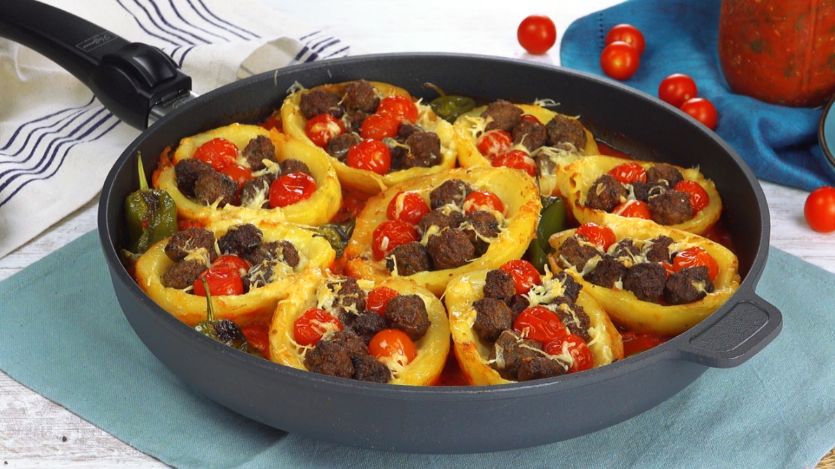 Heute entführen wir dich in die köstliche Welt der Kartoffelpfanne. In der Regel kommen bei einer Kartoffelpfanne alle Zutaten einfach wild in die Pfanne. Aber nicht bei diesem Rezept. Für die Kartoffelpfanne mit Fleischbällchen und Bratpaprika werden ganze Kartoffelhälften frittiert und dann auf ein Bett aus würziger Tomatensoße gesetzt. Gefüllt werden die Kartoffeln mit Fleischbällchen (die mit einem superpraktischen Trick zubereitet werden) und Cherrytomaten. On top gibt es noch leckere Bratpaprika. Ein tolles, herzhaftes Gericht, nicht nur für die kälteren Tage.