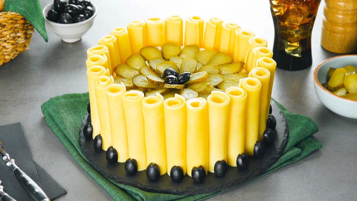 4. Entferne dann den Ring der Springform. Rolle die Käsescheiben ein (wenn sie nicht halten wollen, kannst du sie leicht mit Mayonnaise bestreichen). Setze die Röllchen dann ringsherum um den Kartoffelsalat-Kuchen. Verziere ihn noch mit schwarzen Oliven.
