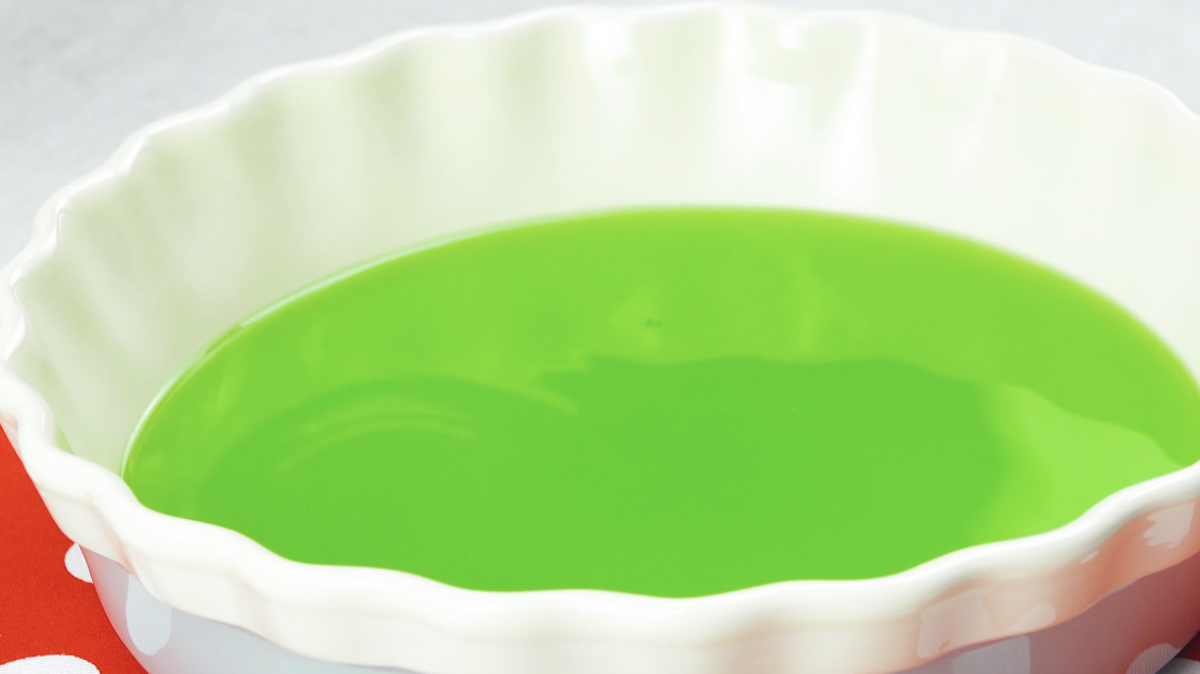 3. Für das grüne Gelee verfährst du genauso, allerdings lässt du den Zucker weg. Fülle das grüne Gelee in eine runde Form und stelle diese ebenfalls mindestens 2 Stunden kalt.