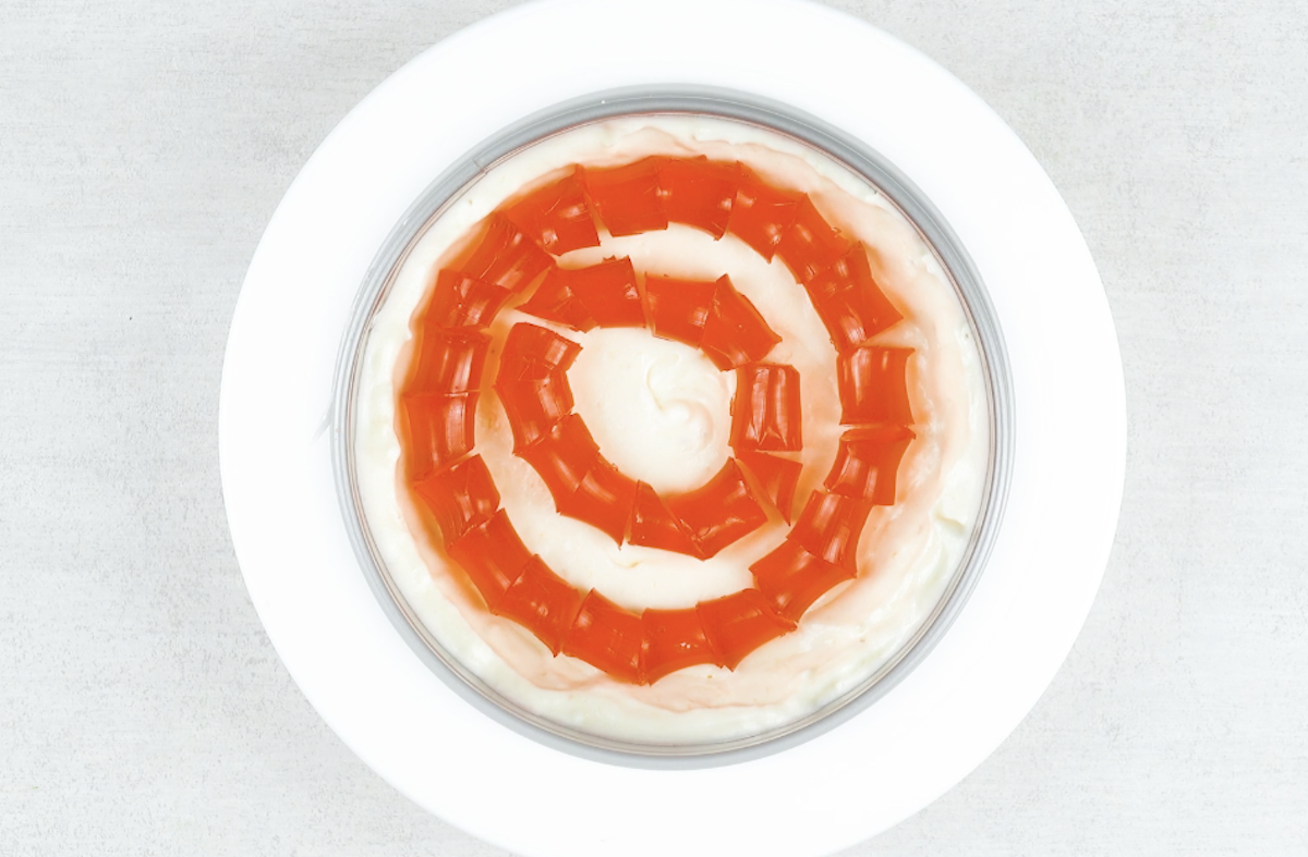 8. Hole die Kuchenform mit dem Keksboden aus dem Kühlschrank und spritze eine dünne Schicht Frischkäsecreme auf den Boden. Lege dann die roten Geleeröllchen in zwei Kreisen auf die Creme (siehe Bild). Spritze in den Raum zwischen den beiden roten Kreisen weitere Creme, die spitzförmig den oberen Rand des roten Gelees überragen muss.