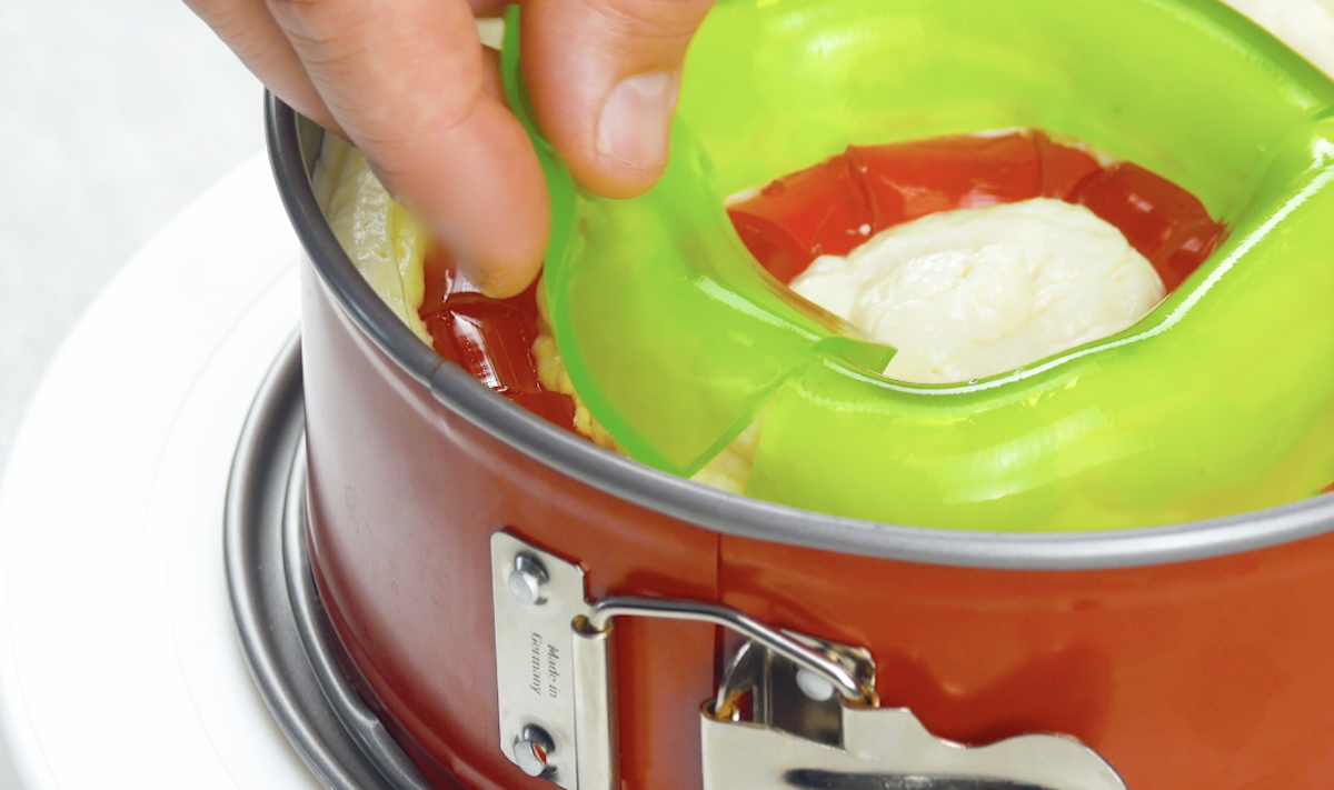 9. Stich mit einem größeren runden Ausstecher einen Kreis aus der Mitte aus des grünen Gelees aus und entferne ihn. Mit dem verbliebenen äußeren Ring bedeckst (überwölbst) du nun die Frischkäsemasse, die du spitz in den Raum zwischen den beiden roten Geleeringen gespritzt hast. Achte darauf, dass beide Enden des grünen Gelees das rote Gelee berühren.