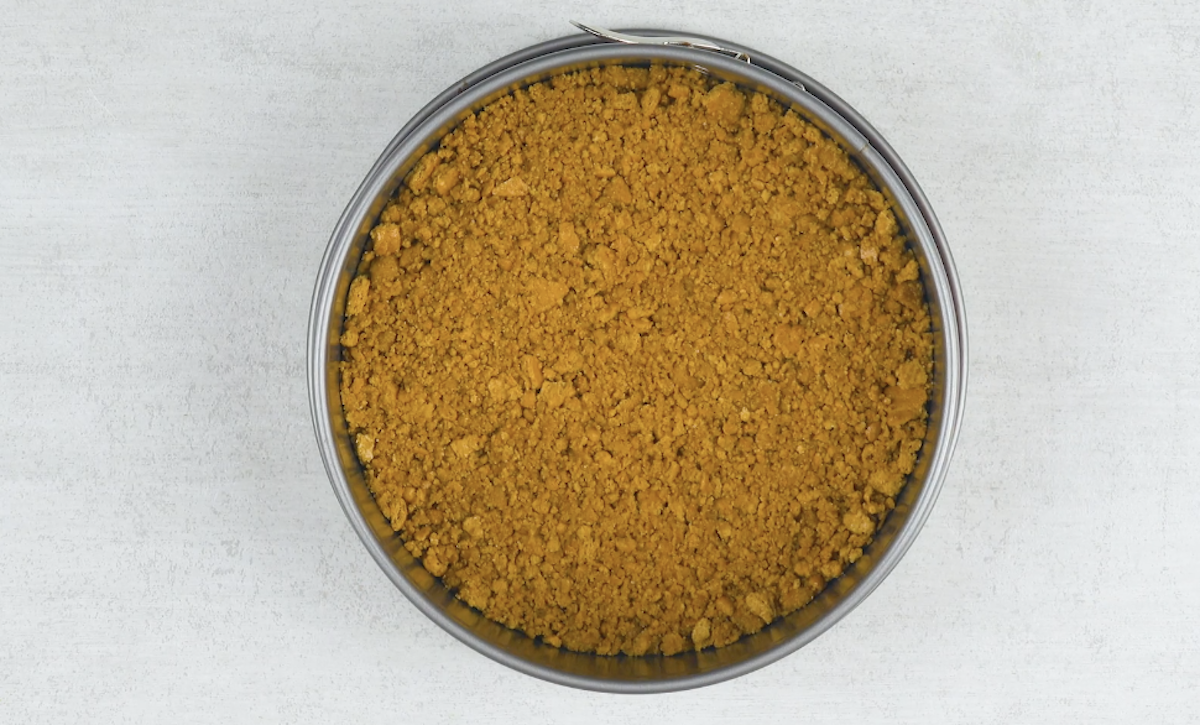 4. Nun zerbröselst du die Vollkornkekse und vermengst sie mit flüssiger Butter und Zucker zu einem Teig. Gib den Teig in eine Kuchenform und drücke ihn am Boden fest. Stelle den Kuchenboden mindestens 1 Stunde kalt.