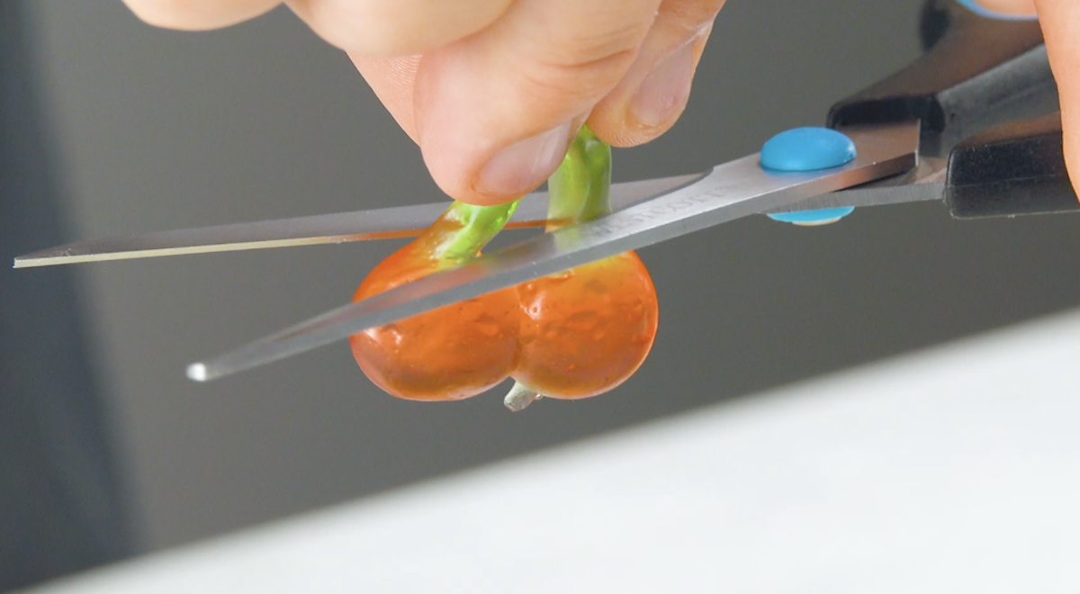 1. Schneide die Haribo Cherries mit einer Schere entzwei, sodass du in einer Schüssel die grünen Teile (100 g) und in einer anderen Schüssel die roten Teile (200 g) sammeln kannst.