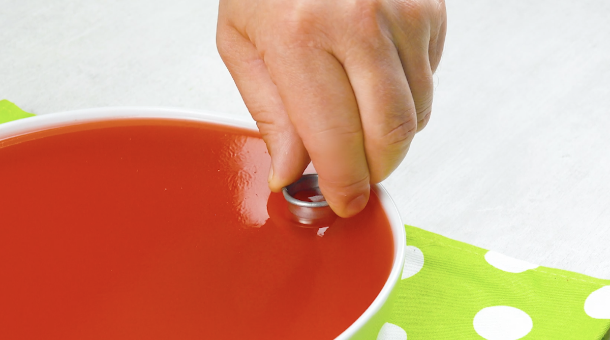 7. Stich mit einem kleinen Ausstecher kleine Geleeröllchen aus dem roten Gelee aus. Gib die Gelee-Reste wieder in einen Topf und schmilz sie, sie werden später für den Kuchendeckel benötigt.