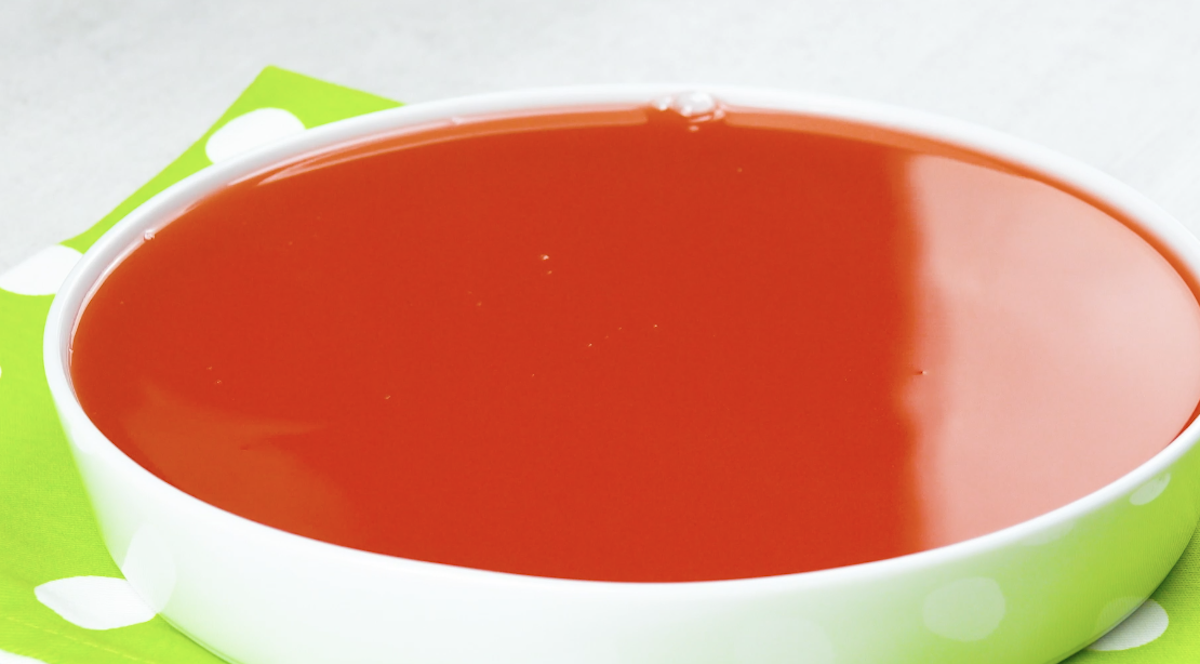 2. Gib die roten Gummiteile in einen Topf und füge Wasser, Zucker, Zitronensaft und eingeweichte Gelatine hinzu. Erwärme alles so lange, bis sich die Gummiteile und die Gelatine aufgelöst haben. Fülle das noch warme Gelee in eine runde und tiefe Form und stelle es mindestens 2 Stunden kalt.