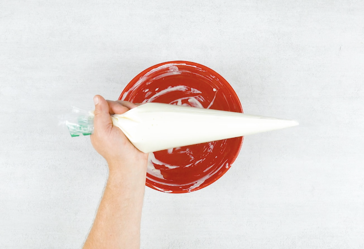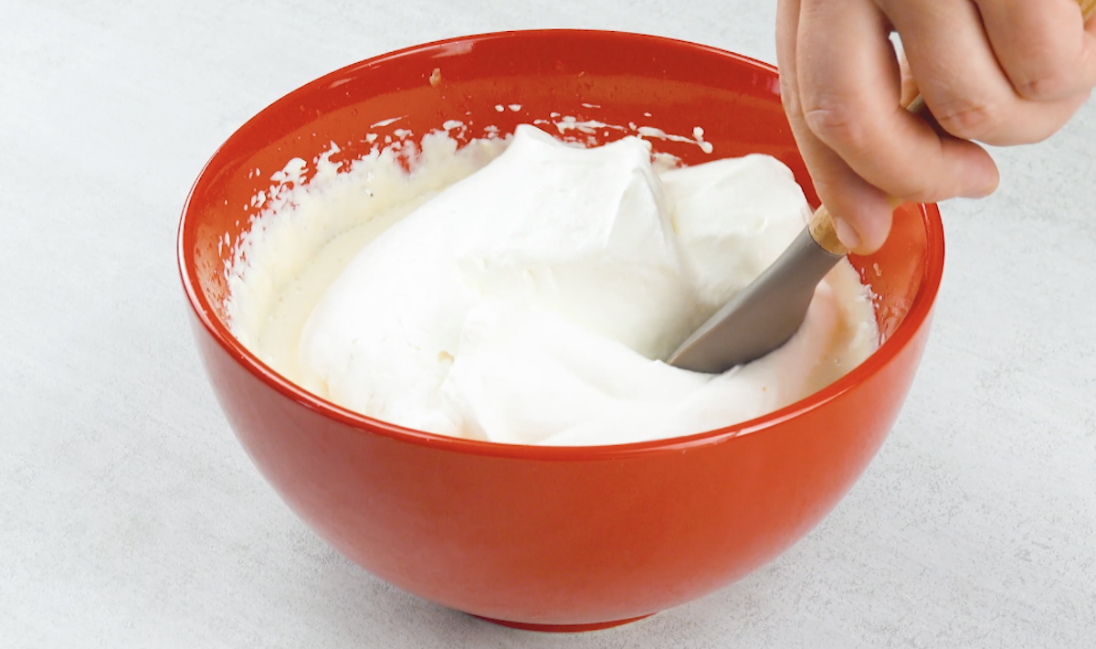 6. Erwärme nun die eingeweichte Gelatine mit einem Teil der Frischkäsemasse in der Mikrowelle und verrühre alles glatt. Gib das Gemisch dann zum Rest der Frischkäsemasse hinzu. Schlage dann Sahne leicht an und hebe sie unter die Frischkäsemasse. Gib noch Vanillearoma und Zitronensaft hinzu. Fülle alles in einen Spritzbeutel.