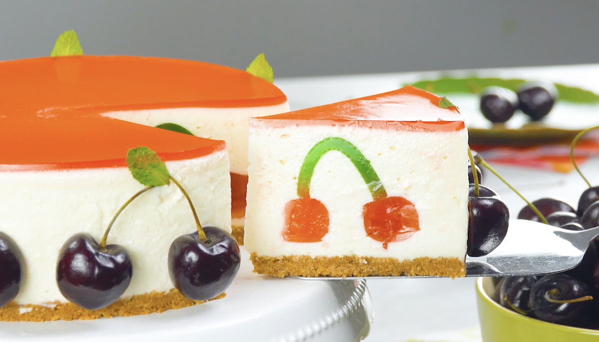 In den 90ern war es das Kultgetränk ohne Alkohol: KiBa. Ein Mix aus Kirsch- und Bananensaft, der alkoholfreies Trinken im Club oder in der Bar salonfähig gemacht hat. Die beiden Säfte ergänzen sich hervorragend, die Süße der Banane und die Säure der Kirsche ergeben den einzigartigen Geschmack. Es wird also höchste Zeit, diesem Kultgetränk zu huldigen – wir präsentieren euch den KiBa-Kuchen. Dank Haribo-Kirschen gewinnen wir zwei verschiedenfarbige Gelees, die dem Kuchen einen besonderen Look verpassen. Wenn man ihn nämlich anschneidet, erwartet einen eine Überraschung. Aber seht selbst!
