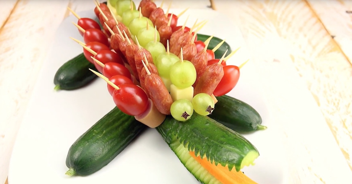 So geht es: Trenne zuerst bei den beiden kleineren Gurken an einer Seite das Ende schräg ab. Halbiere dann die Gurken. Die vier Stücke dienen später als Krokodilbeine. Die andere Gurke wird zum Krokodilkörper. Schneide hierfür ebenfalls an einer Seite das Ende – diesmal gerade – ab. Mache dann längs an diesem Ende einen ca. 10 cm langen Einschnitt in Form eines spitzwinkligen Dreiecks, um das Maul zu gestalten. Dieses sollte nicht genau auf mittlerer Höhe, sondern eher im unteren Drittel sitzen. Schnitze dann gleichmäßige Zacken in Ober- sowie Unter„kiefer“, damit das Krokodil Zähne bekommt. Statte den Körper nun mit den Beinstücken aus und lege dem Reptil einen in Zungenform geschnittenen Möhrenstreifen in den Mund. Als Augen benutzt du Weintrauben, die du mit Zahnstochern auf der Oberseite des Gurkenkörpers befestigst. Als letzten Schliff kannst du Nelken als Pupillen auf die Augen setzen. An diesem Punkt sind deiner Kreativität fast keine Grenzen gesetzt: Nimm Trauben, Salami, geschnittene Würstchen, gewürfelten Käse und Tomaten und pikse immer ein bis zwei der Zutaten auf einen Zahnstocher. Ordne die bunten Spießchen in 5 Reihen seitlich und oben entlang des Körpers an, sodass die schmackhafte Echse zum Schluss mit bunten „Stacheln“ übersät ist. Da probiert man doch gerne mal Krokodil.