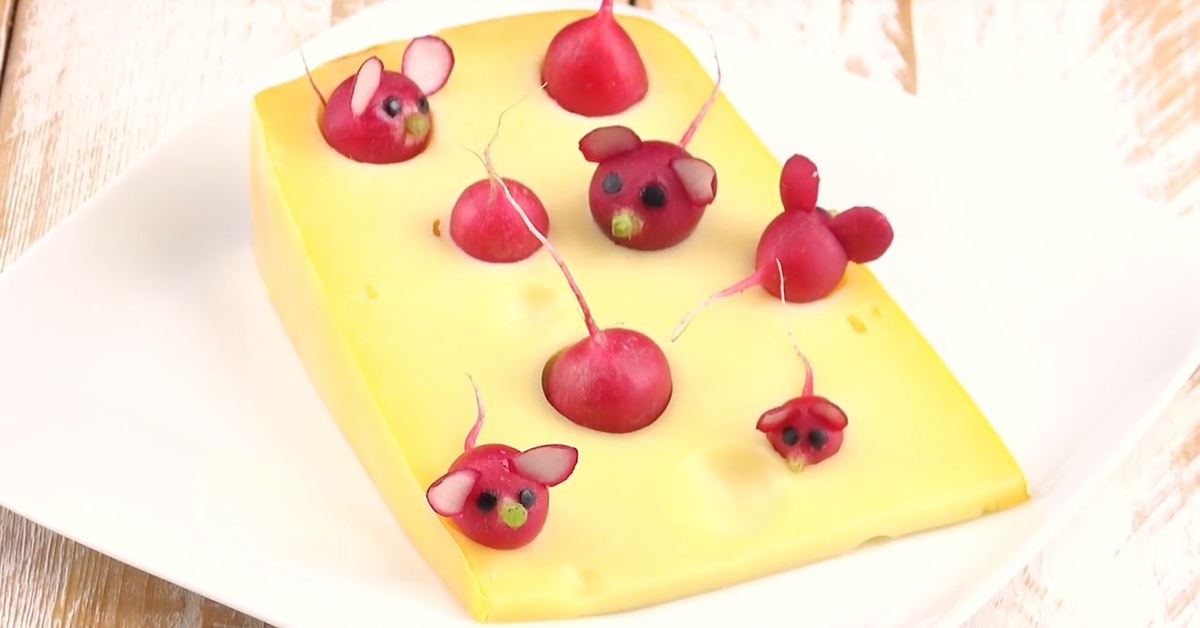 So geht es: Schneide zunächst das obere Ende der Radieschen (das mit Blättern) so zurecht, dass es die Form eines Stöpsels erhält. Dieser wird die Mausnase darstellen. Die Wurzel wird das Schwänzchen. Die Knollenmäuse werden später übrigens in die Löcher des Käsestücks gesetzt. Von den Radieschen, die später nicht als Mäuse in den Käse kommen, schneidest du rundherum kleine Scheiben ab. Diese werden den Mäusen als Ohren eingesetzt. Dafür musst du an entsprechender Stelle zwei Schnitte in die Radieschen machen. Schneide nun eine Olive in so kleine Stückchen wie möglich und setze zwei davon als Augen zwischen Nase und Ohren. Schon sind die Tierchen bereit für ihren Platz in den Käselöchern!