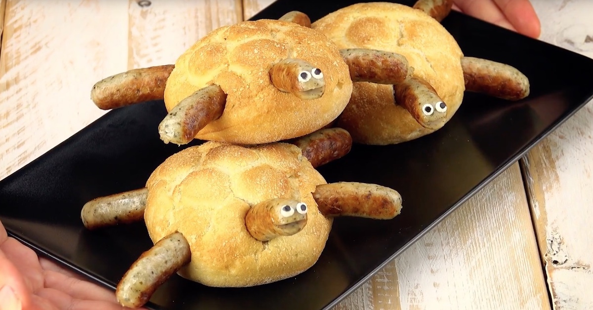 So geht es: Bohre zunächst mit einem scharfen, spitzen Messer 5 Löcher in jedes Brötchen. Der Lochdurchmesser muss jeweils so groß sein, dass ein Würstchen hineinpasst. Setze für den Schildkrötenkopf eines der Löcher etwas höher an als die anderen. Stecke dann die Würstchen in die Brötchenlöcher. Aus der „Kopfwurst“ schneidest du nun für den Mund vorne eine Ecke heraus. Anschließend setzt du darüber 2 Tupfer Mayonnaise und darauf als Pupillen noch 2 winzige Stückchen Olive – für diese niedliche Idee haben wir uns übrigens auf der Internetseite Kochen mit Humor inspirieren lassen, auf der Wolfgang Ries seine kreativen Kochkünste teilt.