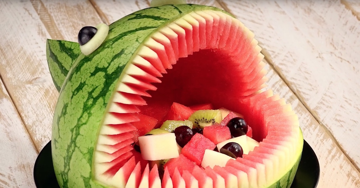 So geht es: Schneide mit einem Brotschneidemesser das obere Ende der Melone etwas abgeschrägt ab. Höhle sie anschließend mit einem Löffel vollständig aus. Dann stellst du sie mit der Öffnung nach unten auf ein Holzbrett. Nimm nun wieder das Messer zur Hand und mache ca. 5 cm über dem Brett einen waagrechten Schnitt. Dieser sollte etwa die Hälfte der Frucht durchtrennen. Dort stoppst du und setzt einen weiteren Schnitt oben in der Mitte an. Schneide so weit nach unten, bis du auf das Ende des ersten Einschnitts triffst und du das große Stück leicht herausnehmen kannst. Kreiere nun mit einem kleineren Messer einen Rand um das entfernte Stück: Dafür schneidest du einen Streifen von ca. 2 cm Breite rundherum um den großen Ausschnitt, der später das Haimaul sein wird. Mache den Schnitt aber nur etwa einen halben Zentimeter tief. Schneide den Rand nun auch innen ab und löse ihn vom Rest der Melone. Anschließend gestaltest du die Zähne. Dafür machst du zuerst einen schrägen Schnitt in beide Ecken des Mauls und zackst dann den Rand rundherum. Als Flosse brauchst du ein großes dreieckiges Stück des „Mauls“, das du zuvor entfernt hast. Das Dreieck befestigst du am Rücken der Melone mithilfe zweier Zahnstocher. Die beiden anderen benutzt du, um die Augen anzubringen. Diese bestehen aus 2 rund geschnittenen Stücken der anderen Melonensorte, die du gewählt hast, und jeweils einer halbierten Traube, die obendrauf gesetzt wird. Zum Schluss bereitest du einen Obstsalat mit den Melonenresten und den Früchten deiner Wahl zu und befüllst das Haimaul damit. So wirkt die Tierart doch gar nicht mehr bedrohlich, oder?