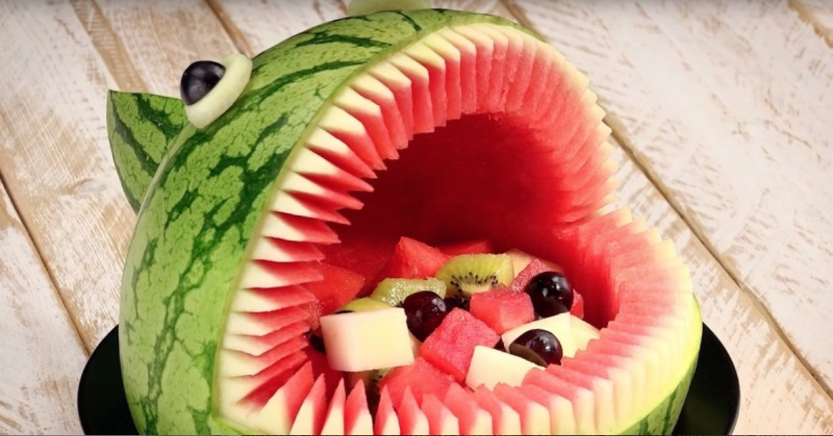 4.) Melonenhai Ist es ein Hai oder eher die Grinsekatze aus Alice im Wunderland? Die eindrucksvollste Art, Obstsalat zu präsentieren, kannst du hier im Detail erfahren.