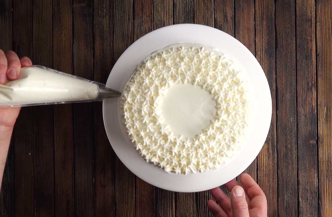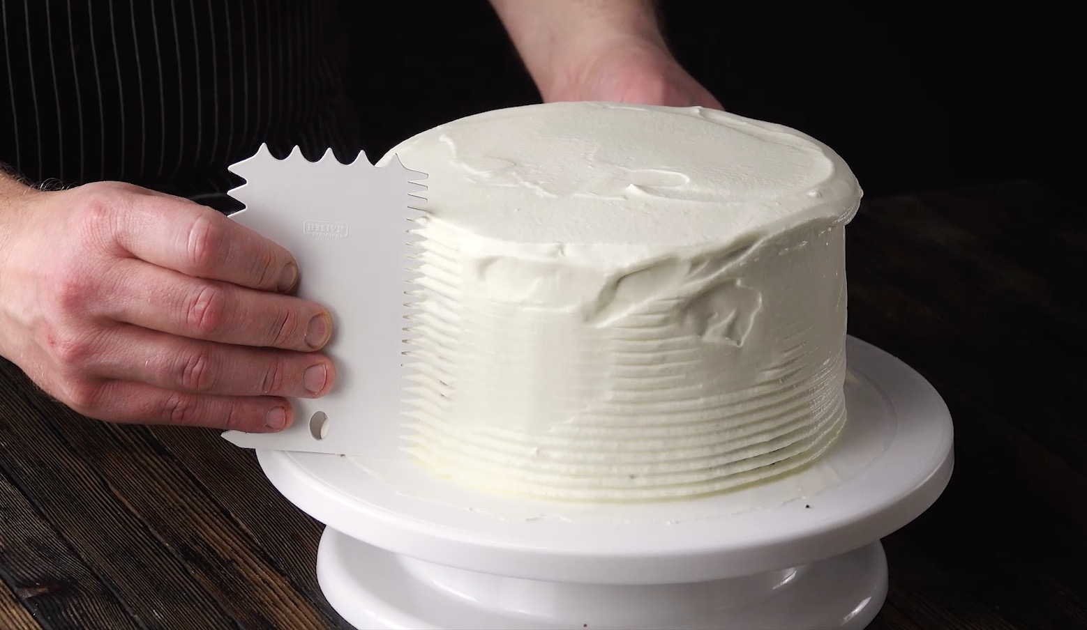 8. Verstreiche nun einen weiteren Teil der Creme rundherum. Behalte für die Dekoration allerdings noch einen kleinen Rest Creme zurück. Verziere den Rand danach mit einem gewellten Tortenkamm.