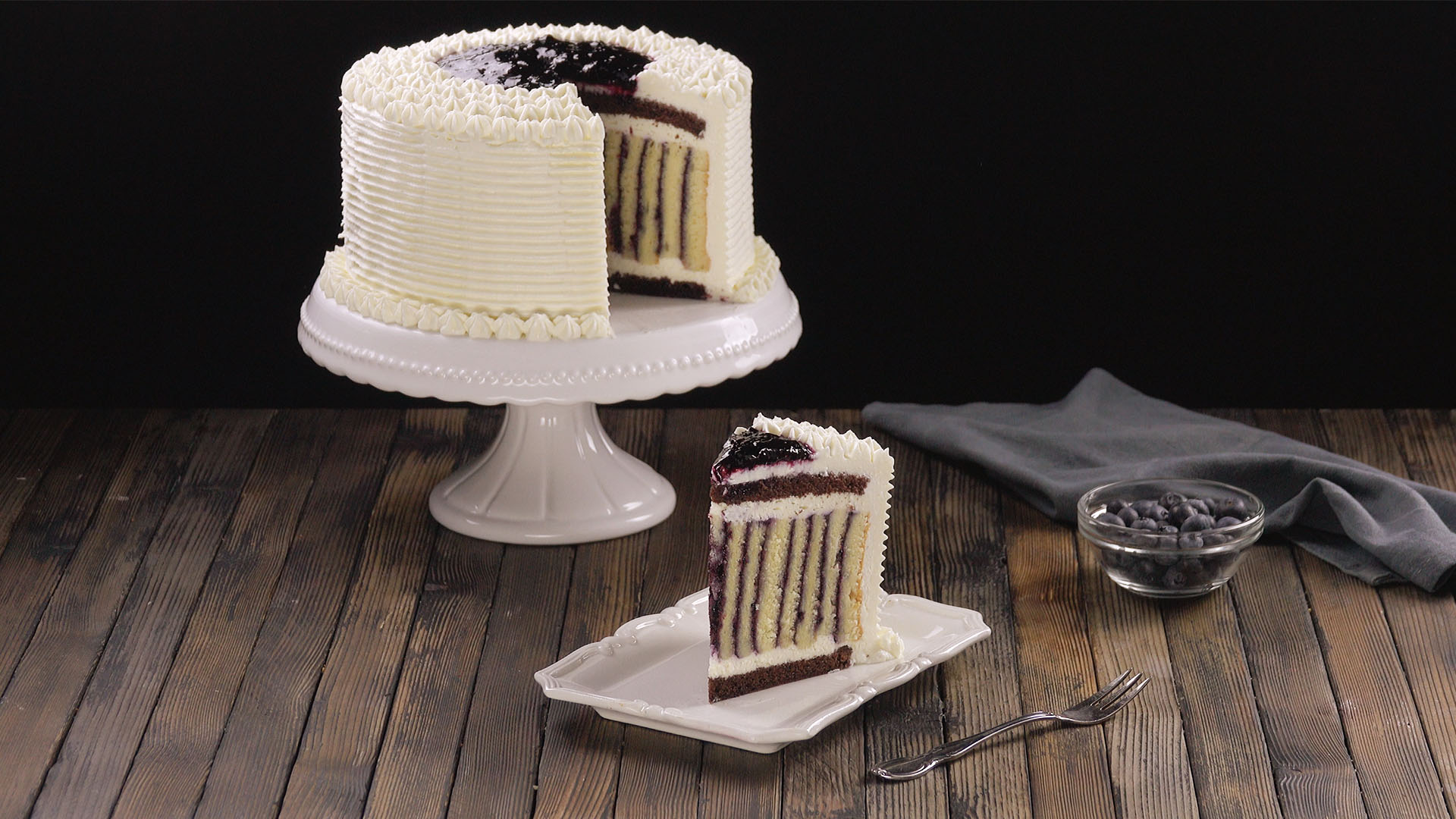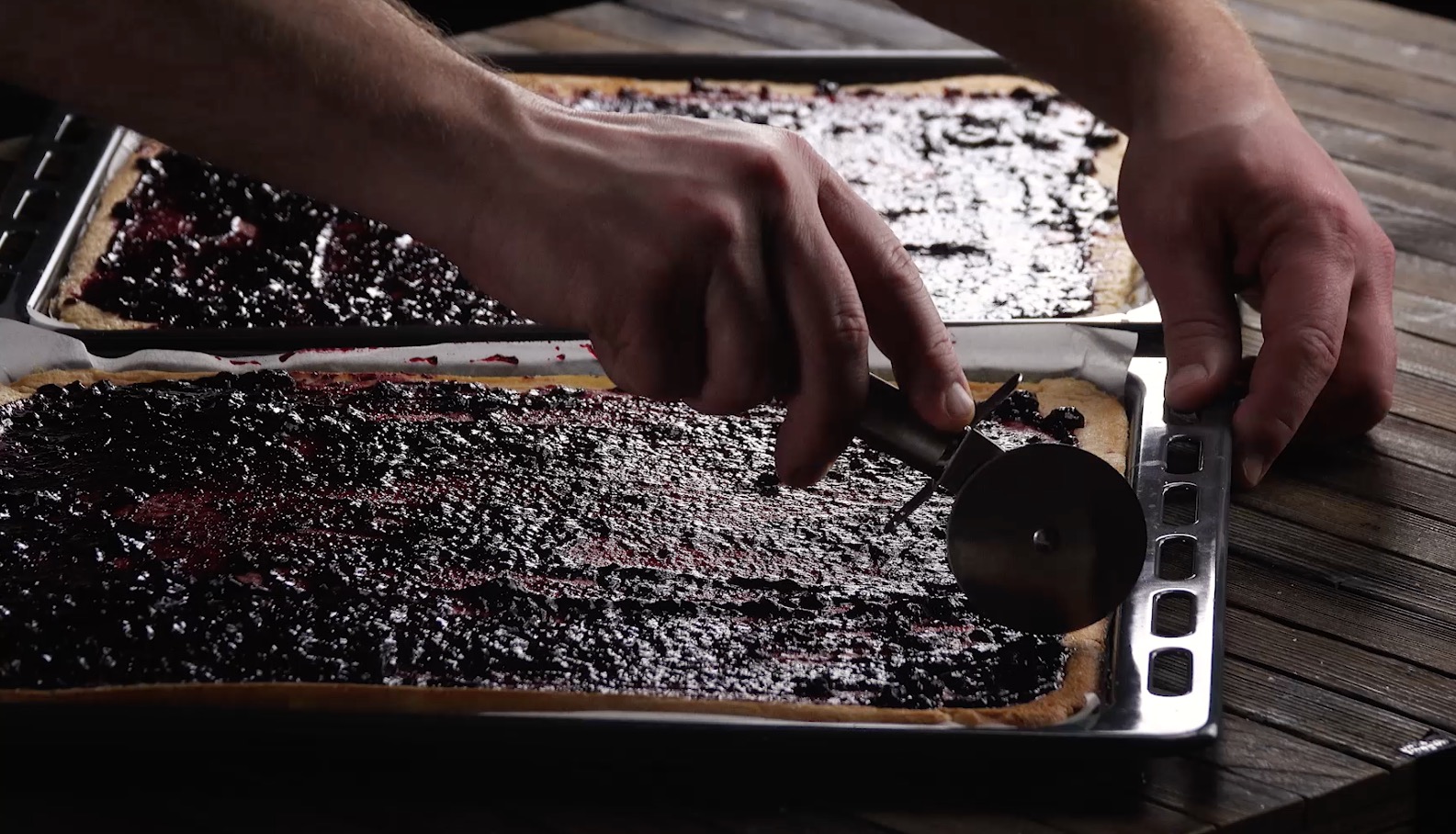 3. Lass den Teig erkalten und verteile mit einem Löffel die Blaubeermarmelade gleichmäßig auf beide Biskuitböden. Lass ein paar Löffel der Marmelade übrig. Schneide anschließend beide Böden längs in fünf gleich breite Streifen.
