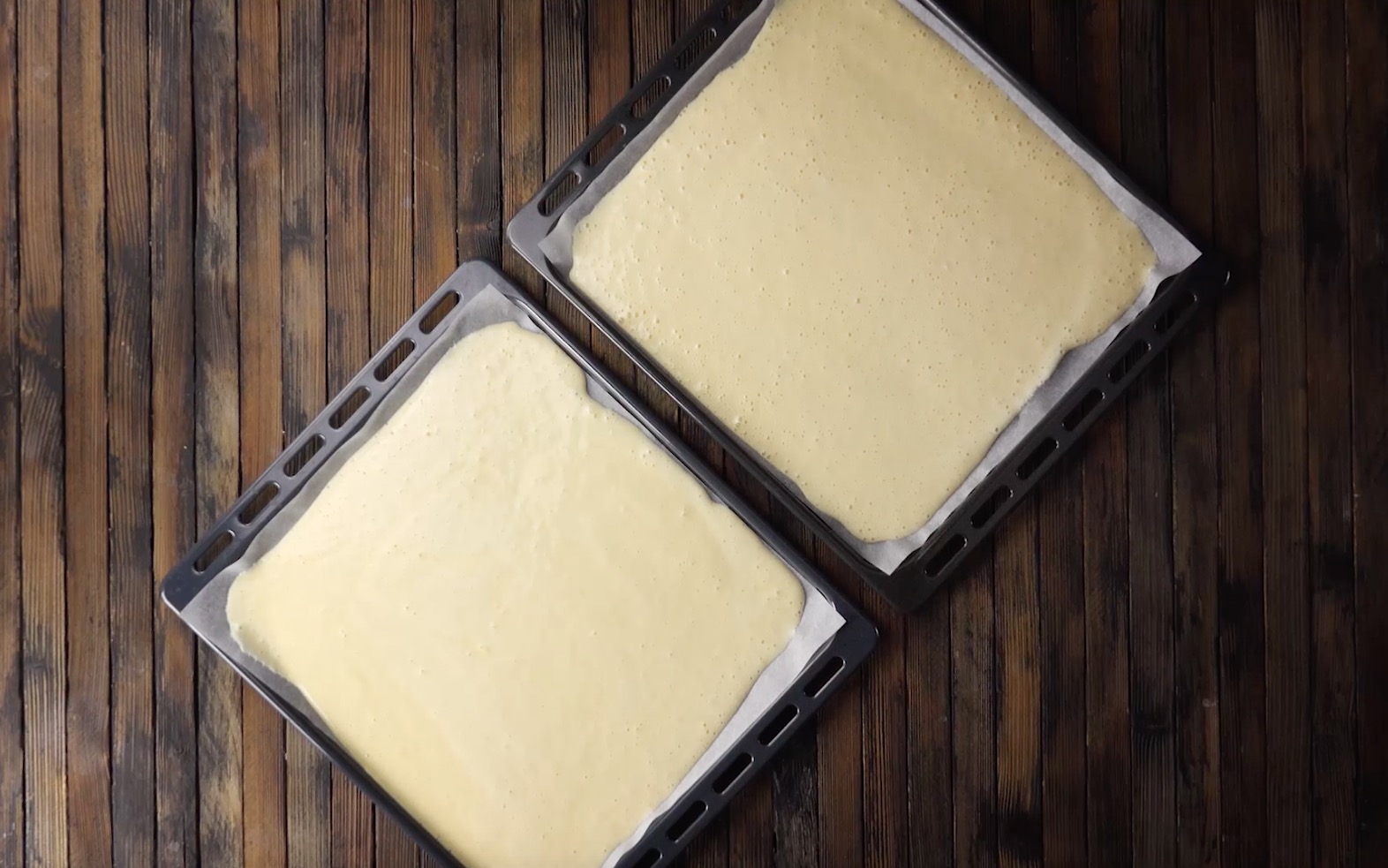2. Verteile den Teig zu gleichen Teilen auf zwei tiefe mit Backpapier ausgelegte Backbleche und backe sie für 18 Minuten bei 170 °C Umluft.