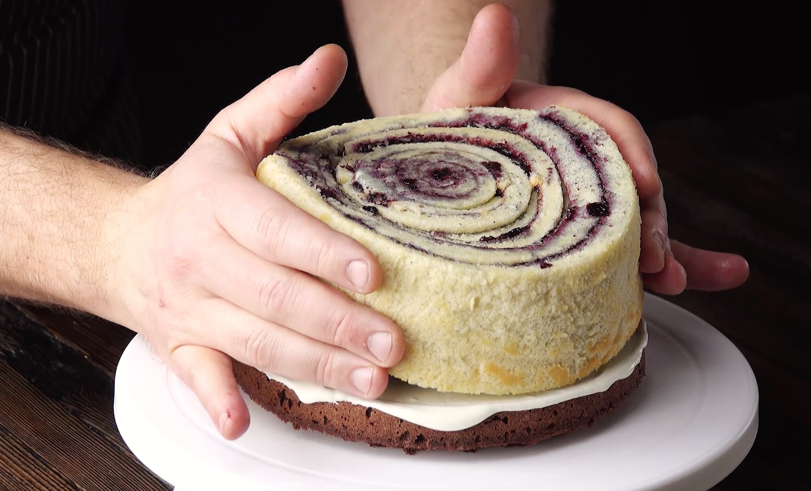 7. Setze die untere Hälfte auf eine Kuchenplatte, bestreiche sie großzügig mit der Creme und setze dann die Marmelade-Biskuit-Rolle darauf. Verteile eine weitere Schicht der Creme auf der Biskuitrolle und setze den zweiten Kuchenboden darauf.