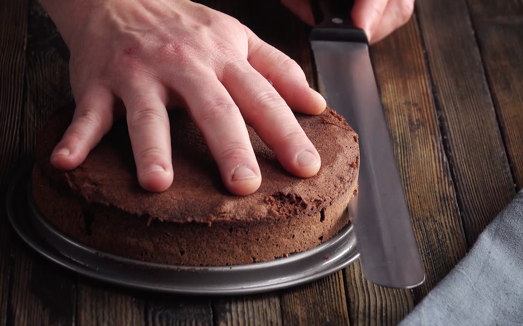 6. Lass den dunklen Biskuit anschließend erkalten und halbiere ihn mit einem scharfen Messer, sodass du zwei Kuchenböden erhältst.