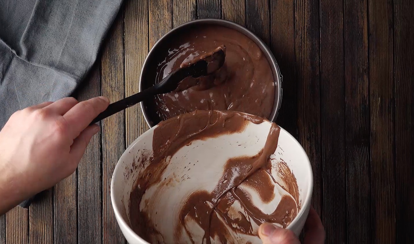 5. Schlage für die Creme den Frischkäse auf und hebe die Sahne unter. In einer anderen Schüssel verrührst du Zucker und Eigelb. Rühre dann nach und nach Kakao und Mehl ein. Fülle den Teig in eine gefettete Springform und backe ihn für 40 Minuten bei 170 °C Umluft.
