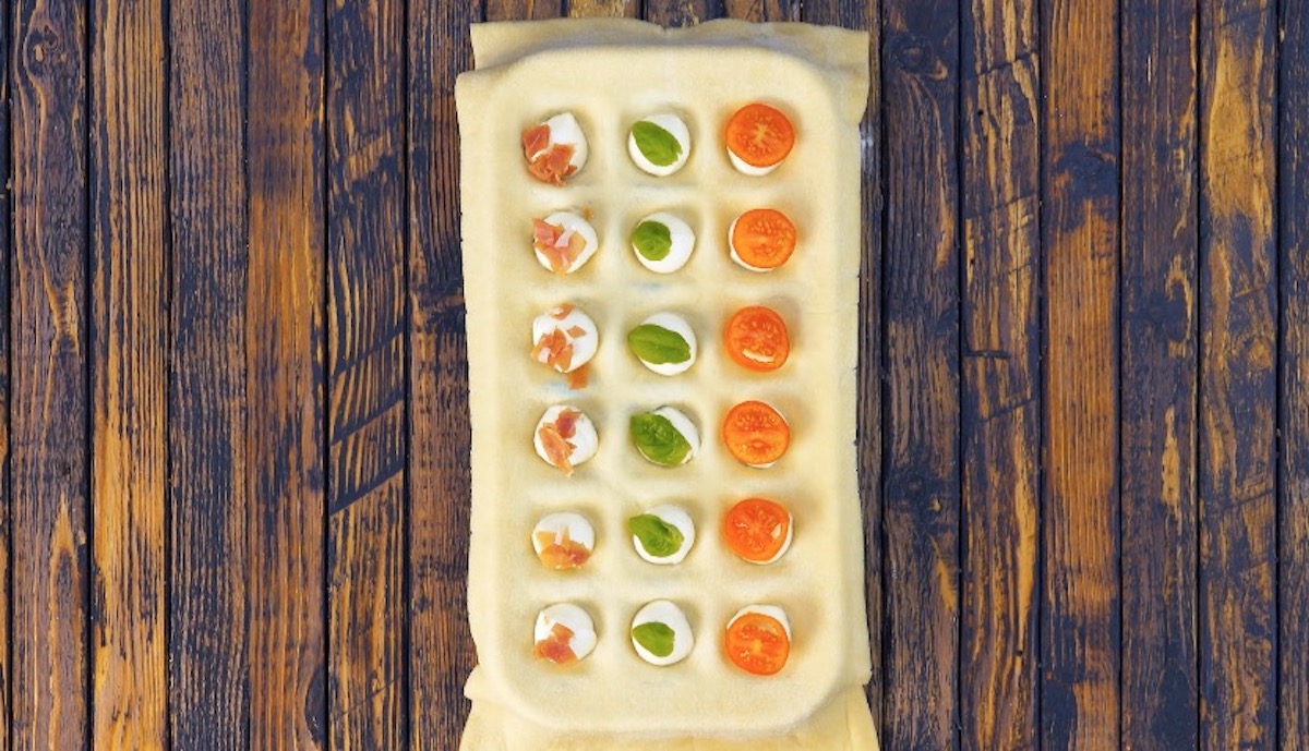 1.) Bemehle eine Eiswürfelform. Halbiere den Pizzateig und lege eine Hälfte auf die Eiswürfelform. Drücke deinen Finger vorsichtig bis auf den Boden der Vertiefungen, um kleine Mulden im Teig zu schaffen.