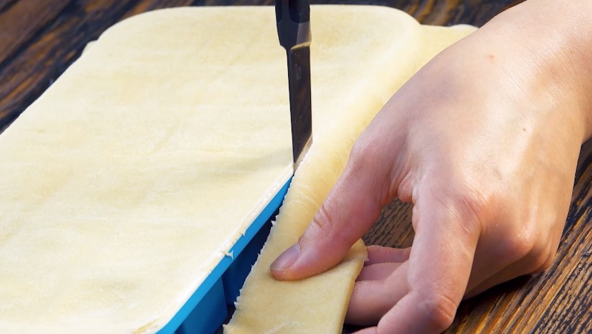 3.) Decke den Teig mit der noch verbliebenen Hälfte des Teiges ab und rolle mit einem Nudelholz über die Form, um die beiden Hälften miteinander zu verbinden. Überschüssigen Teig am Rand schneidest du mit einem Messer ab.