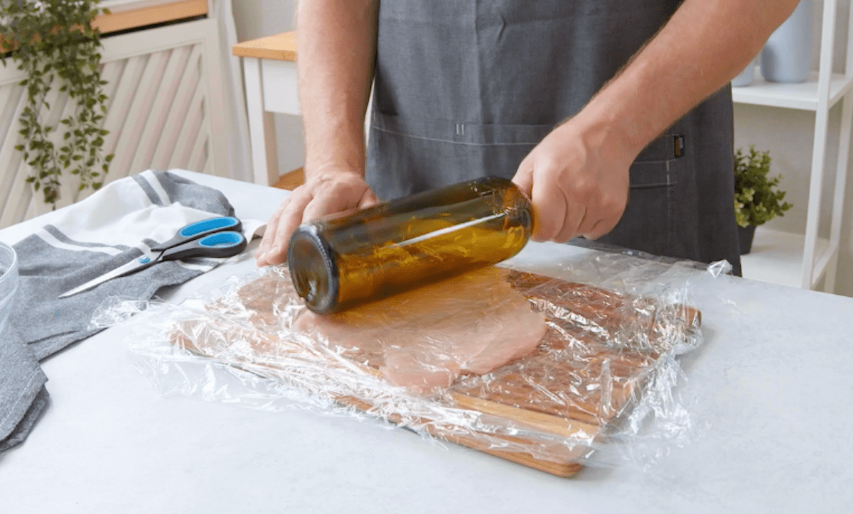 1. Schneide die Hähnchenbrüste mit je einem Schmetterlingsschnitt ein und lege sie dann einzeln zwischen zwei Lagen Frischhaltefolie. Plätte das Fleisch gleichmäßig mit einer leeren Weinflasche.