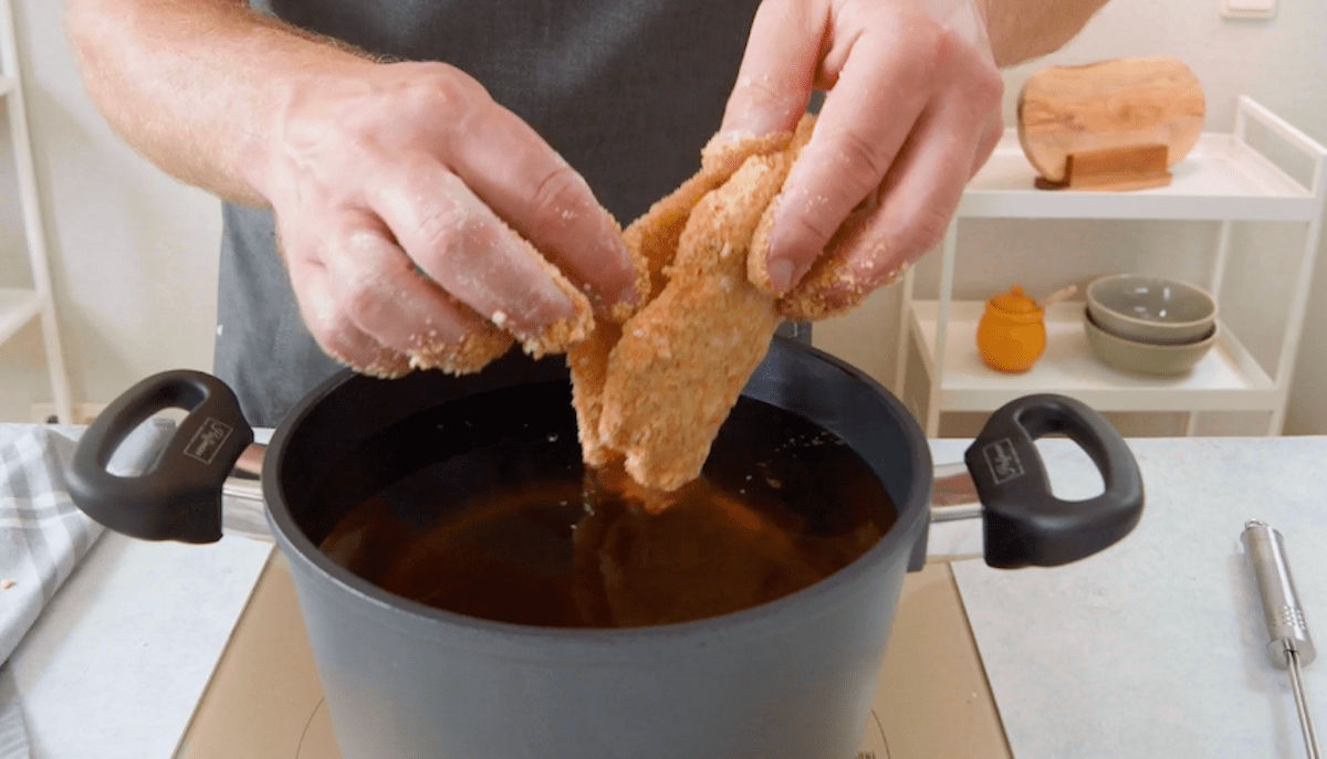 5. Wälze die Hähnchenbrüste nun im gewürzten Mehl, ziehe sie durch die verquirlten Eier und wende sie anschließend in der Cracker-Panade. Frittiere das Fleisch für ca. 5 Minuten in ca. 170 °C heißem Fett.