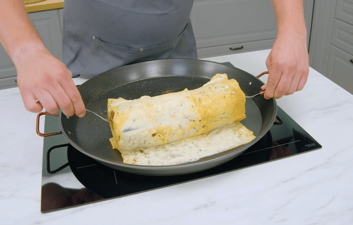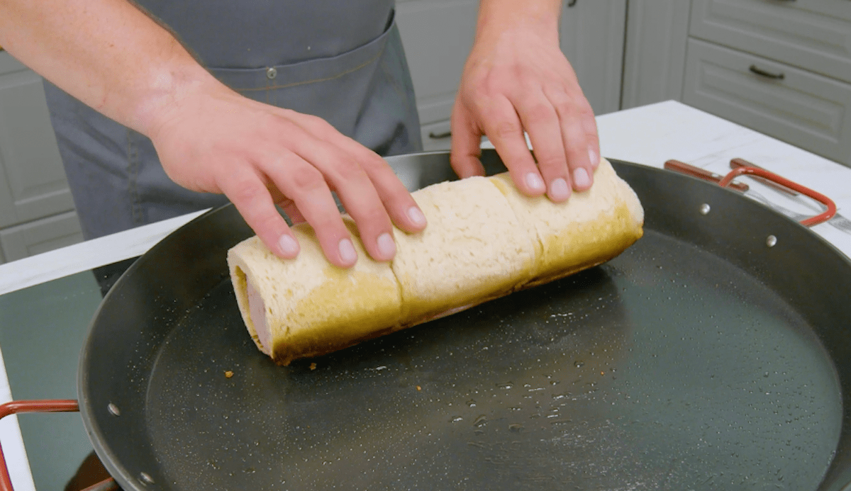 3. Lege 5 Scheiben Käse in die Pfanne und rolle mit ihnen die Toast-Wurst-Rolle ein. Stecke je eine Gabel in beide Enden der Rolle, damit du diese bequem bewegen kannst. Nimm die Rolle aus der Pfanne und lass sie ca. 15 Minuten abkühlen.