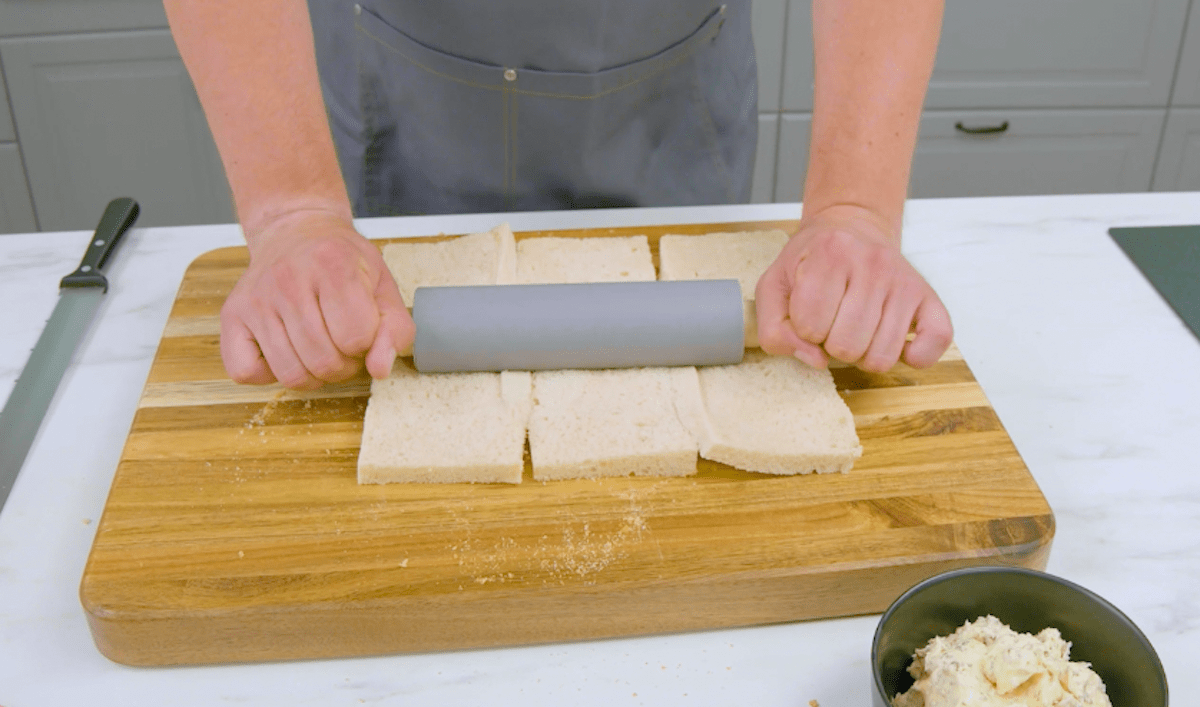 1. Streue die gehackte Petersilie, den gehackten Schnittlauch sowie Salz und Pfeffer auf ein Brett und rolle das Stück Butter darin ausgiebig hin und her. Lege die so entstandene Kräuterbutter dann in einen Messbecher und rühre sie über einem Wasserbad cremig. Schneide nun das Kastenbrot der Länge nach in drei jeweils ca. 1 cm breite Scheiben. Entferne die Brotränder, lege die drei Scheiben einander leicht überlappend auf das Brett und rolle sie mit einem Nudelholz platt.