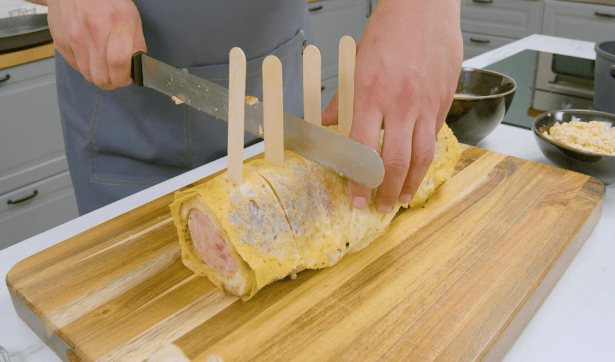 5. Stich 6 Eisstiele in gleichmäßigen Abständen in die Wurst-Rolle und schneide diese zwischen den Stielen in 6 Einzelstücke. Ziehe die Wurst-Lollis dann erst durch den Bierteig und dann durch die Ramen-Panade.