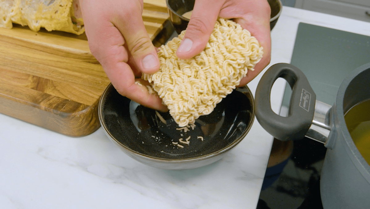 4. Für den Bierteig gibst du alle Zutaten in eine Schüssel und rührst sie mit einem Schneebesen glatt. Lass den Teig kurz quellen und verrühre ihn dann nochmals. Zerkleinere anschließend die Ramen-Nudeln und gib sie in eine Schüssel.