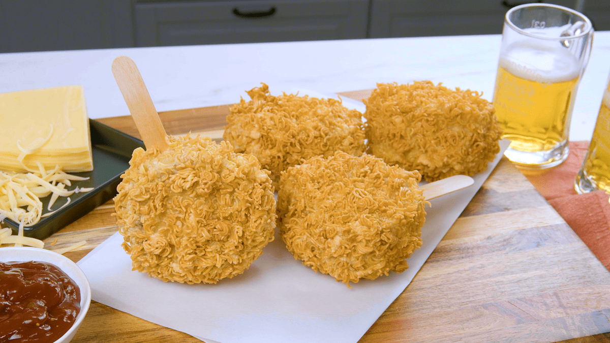 So einfach lassen sich Wurst-Lollis der besondern Art auf den Tisch zaubern. Die Kräuterbutter und der Käse machen den Kern der Lollis supersaftig und von außen knuspert es dank der Ramen-Panade höchst verführerisch. Die Wurst-Lollis sind schon jetzt ein neuer Star am Snackhimmel.