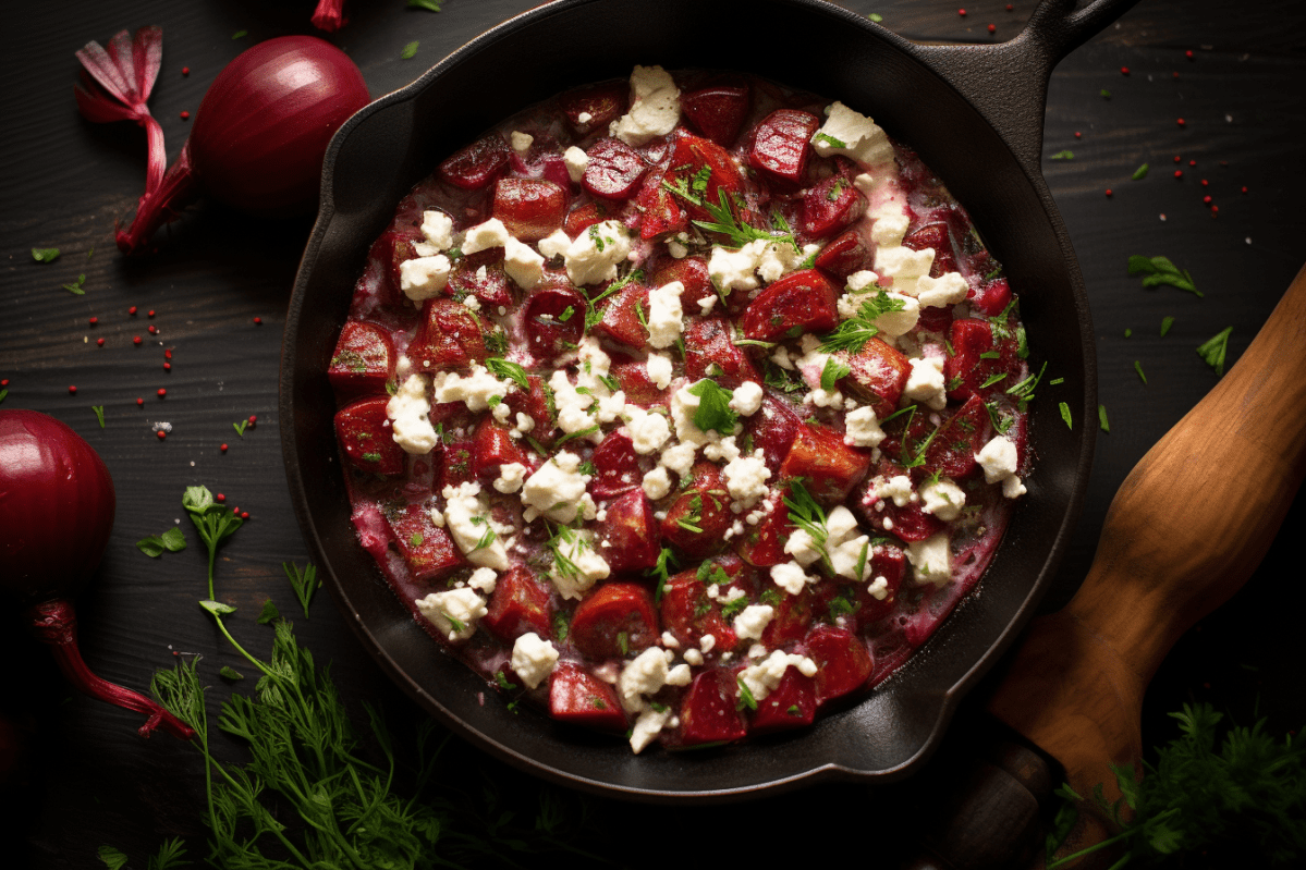 Aber zurück zu unserem leckeren Rezept. Die Rote Bete-Pfanne vereint die süßlichen, erdigen Töne der Roten Bete mit der würzigen Tiefe von Zwiebeln und ausgewählten Gewürzen. Die Vollendung findet das Gericht durch die salzige Frische des Fetas und das aromatische Flair des Dills. Diese Kombination kreiert nicht nur ein Fest für die Sinne mit ihrem Kontrast von Aromen und Texturen, sondern es nährt auch den Körper mit einer Fülle von Nährstoffen. Das perfekte Gericht, um sich in der kälteren Jahreszeit von innen zu wärmen und das Immunsystem zu unterstützen.