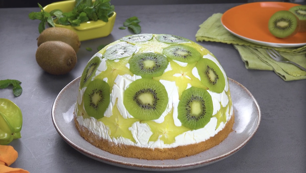 In welche Kategorie würdest du dieses Rezept einordnen, Kuchen oder Dessert? Letztendlich ist es natürlich egal, denn am Ende kommt es nur auf den Geschmack an – und der ist bei dieser fruchtigen Kuppel einmalig, denn Sternfrucht, Kiwis, Joghurt und Biskuitboden harmonieren so perfekt miteinander, als wären sie nie getrennt voneinander gewesen.