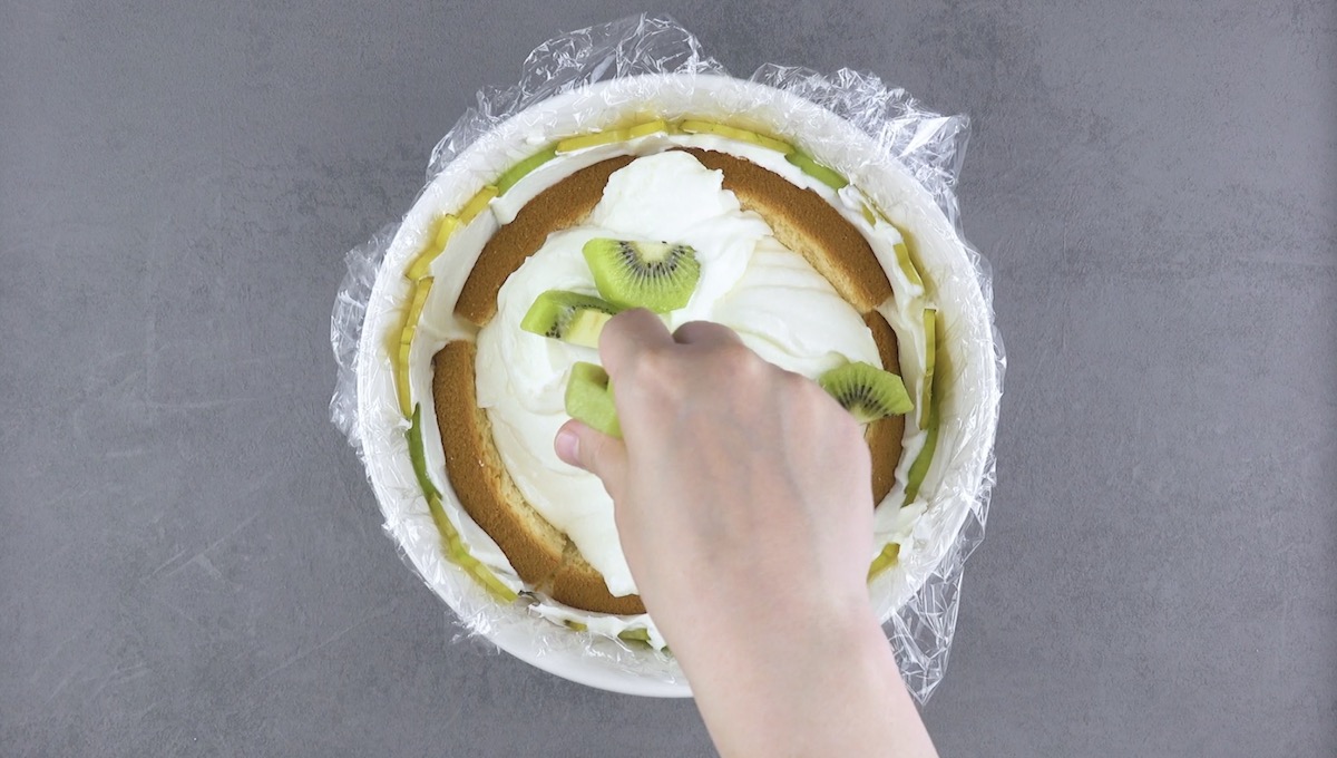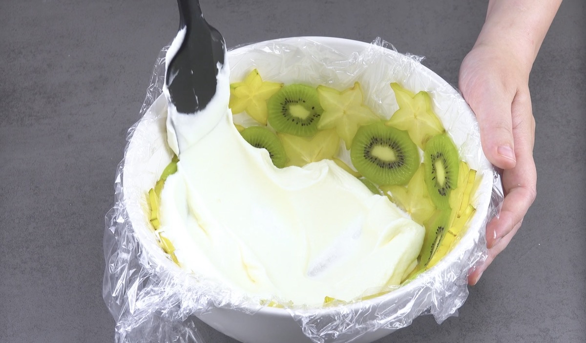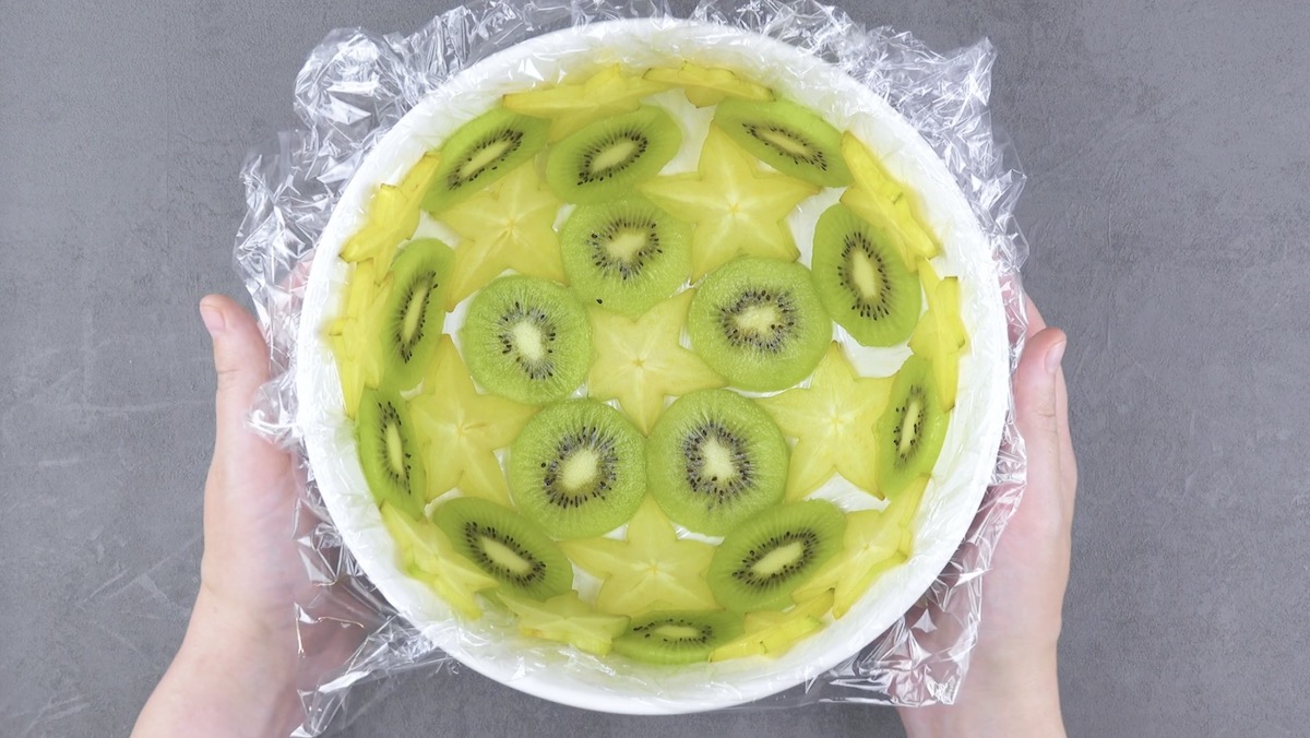 1.) Schneide die Sternfrucht und zwei Kiwis in Scheiben. Lege eine Schüssel (ca. 24 cm Durchmesser) mit Klarsichtfolie aus und verteile die Fruchtscheiben in der Schale; lass zwischen den Scheiben dabei so wenig Zwischenraum wie möglich.