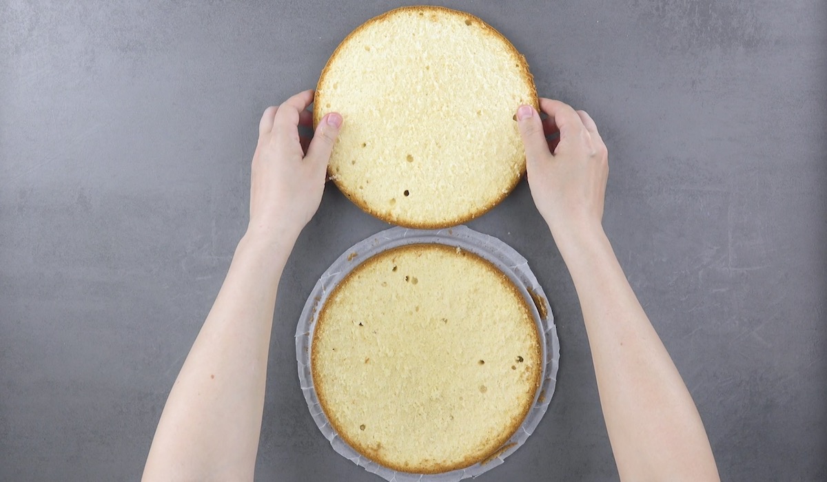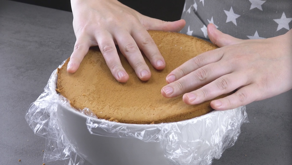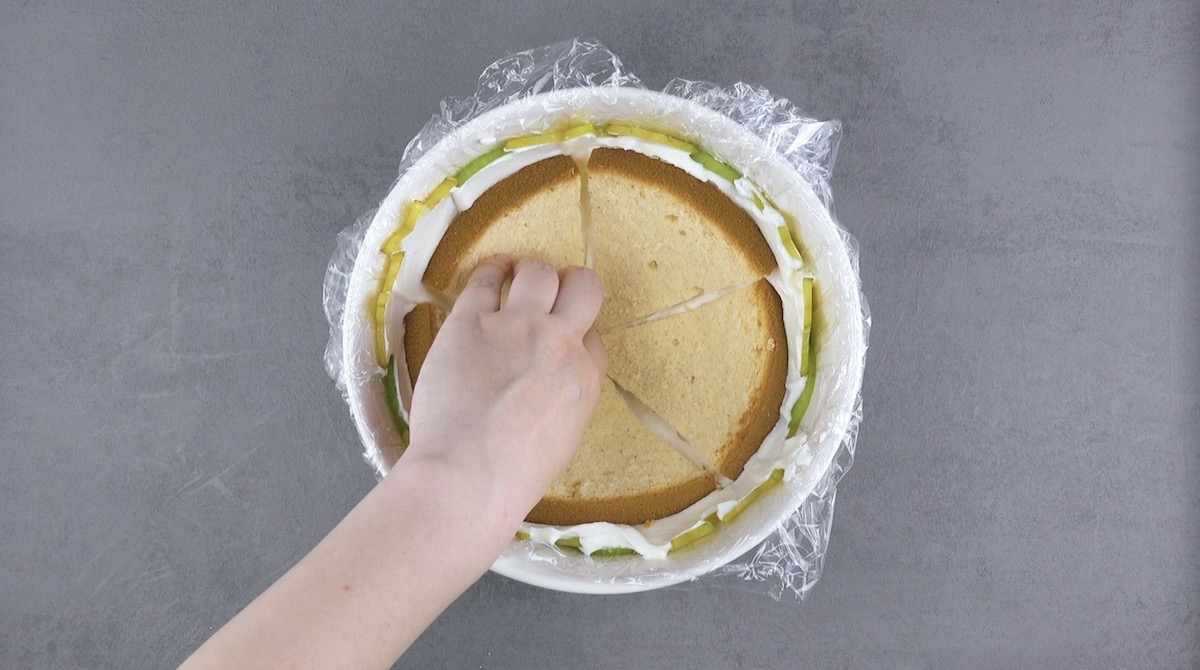 9.) Lege zum Abschluss den zweiten Biskuitboden auf die Schüssel und drücke ihn vorsichtig an.