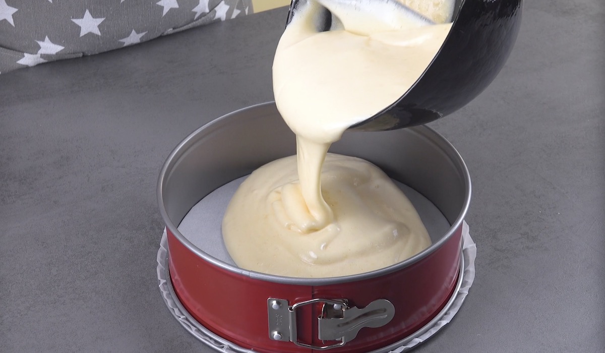3.) Schlage für den Biskuitboden zunächst Eier und Zucker schaumig auf. Hebe dann das gesiebte Mehl vorsichtig unter. Fülle den Teig dann in eine mit Backpapier ausgelegte und eingefettete Backform (ca. 24 cm Durchmesser) und backe ihn für 15 Minuten bei 180 °C Umluft goldbraun.