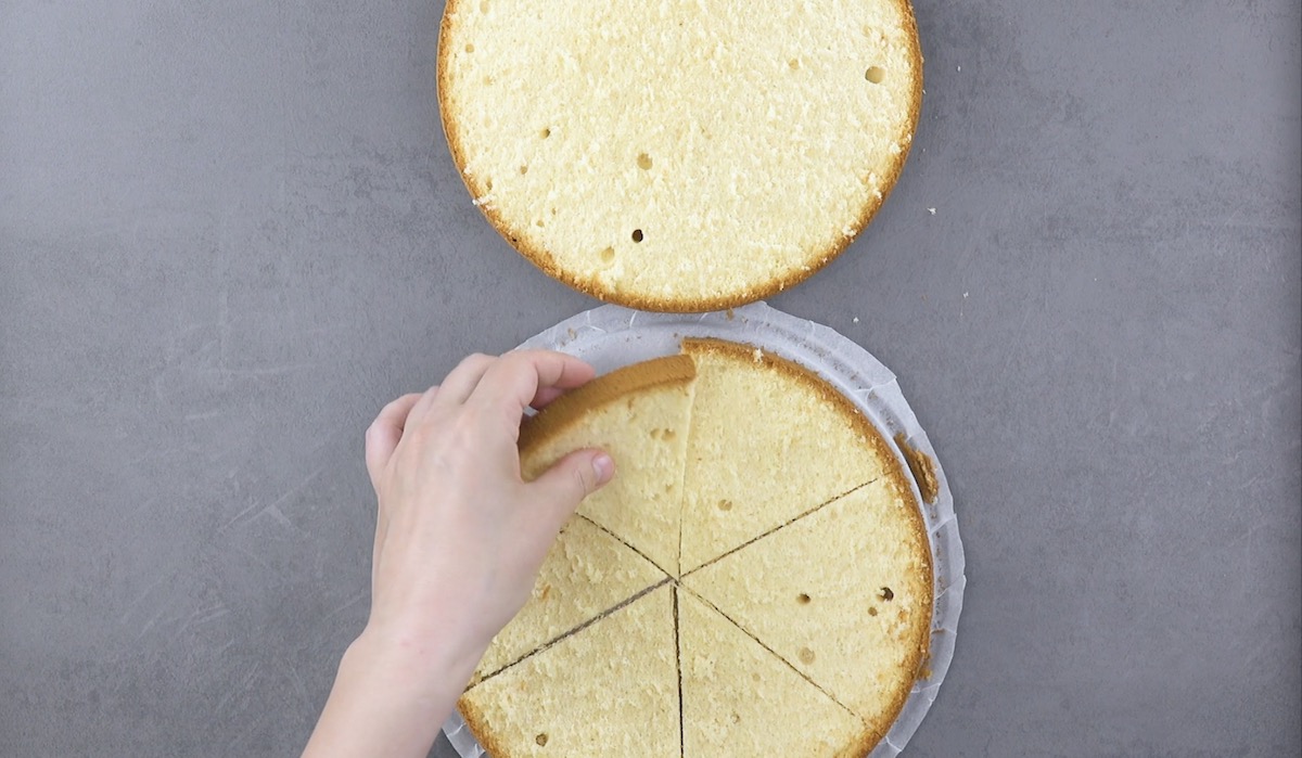 5.) Schneide einen Kuchenboden in 6 gleich große Teile.