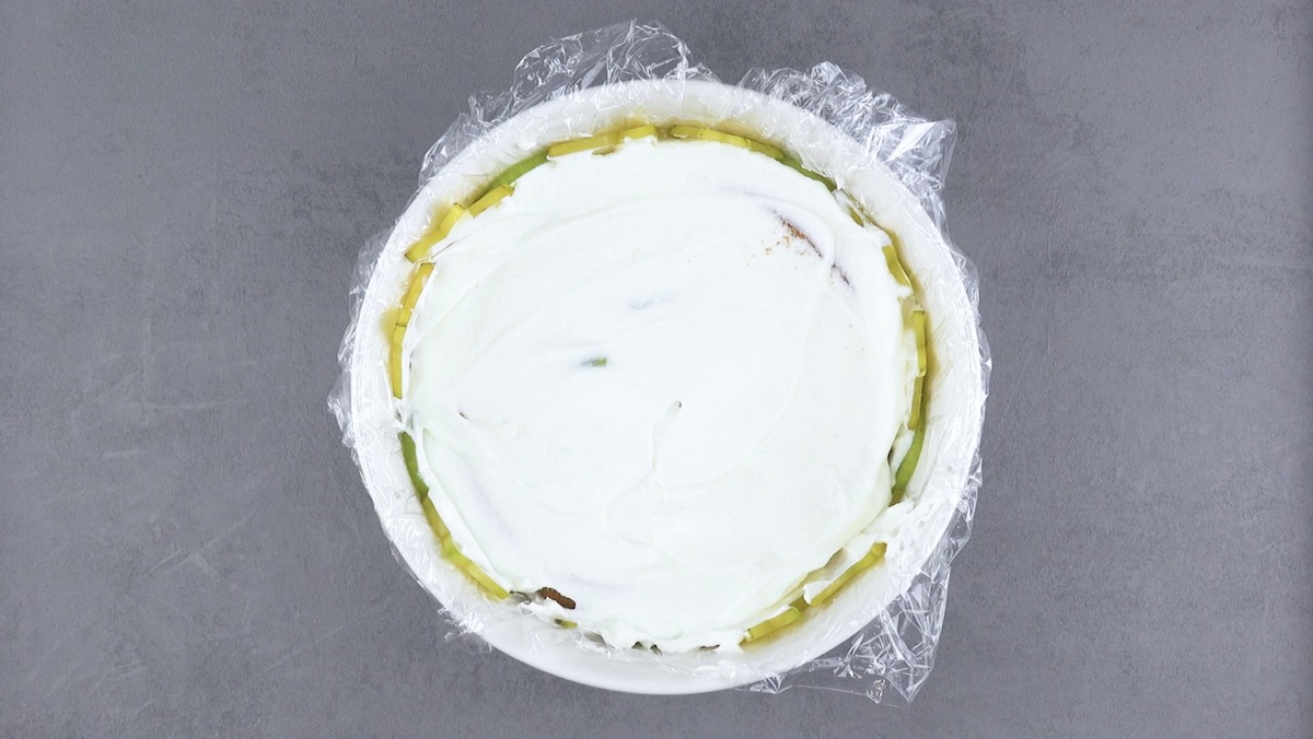 8.) Drücke die Kiwis in die Joghurtcreme und streiche die überschüssige Creme glatt.