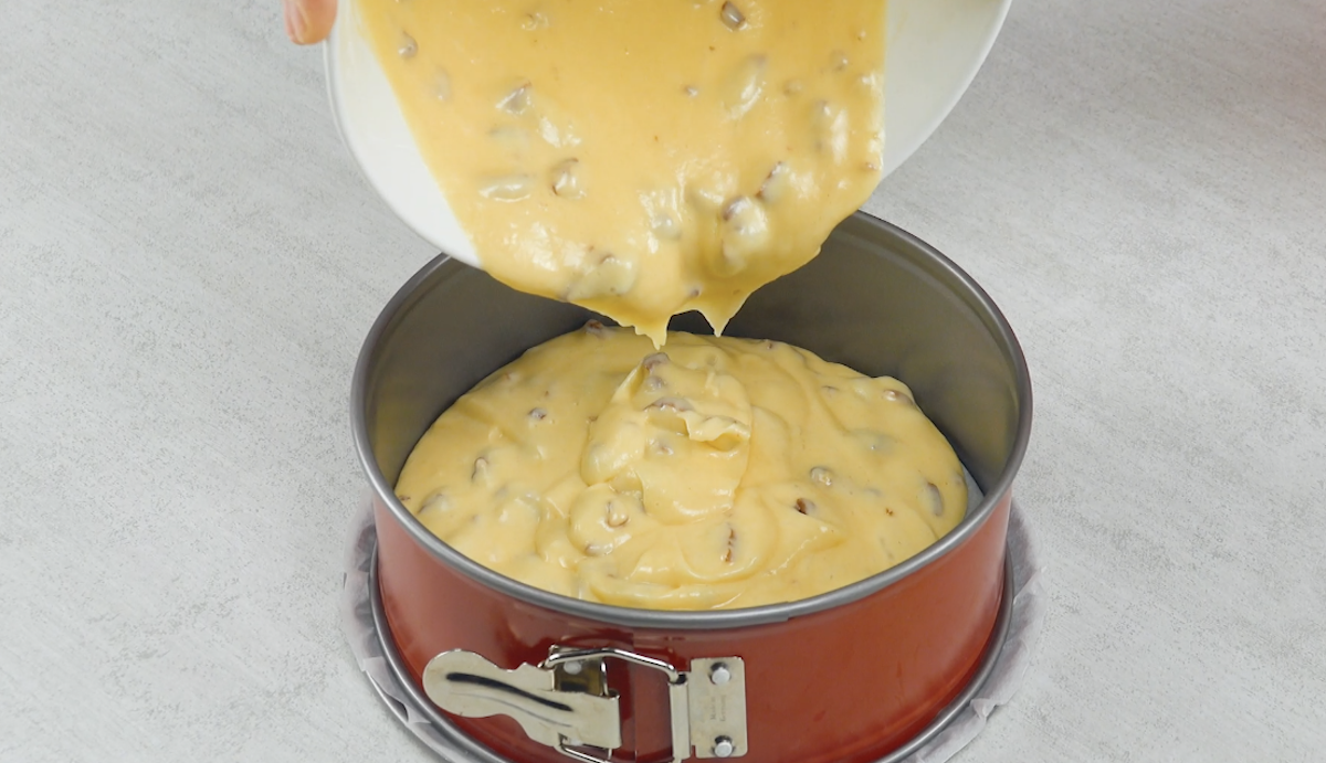 So geht es: 1. Rühre Eier, Öl, Zucker und Joghurt mit einem Handrührgerät schaumig. Gib dann Mehl, Backpulver (vermische zuerst Backpulver mit Natron, das wird zwar im Video nicht gezeigt, ist aber wichtig fürs Rezept) und Salz dazu und verrühre alles weiter. Hebe dann kleingehackte Pekannüsse mit einem Teigschaber unter. Verteile den Teig auf 3 Kuchenformen, deren Böden mit Backpapier ausgelegt und deren Ränder gefettet sein sollten. Schiebe die Kuchenböden bei 170 °C Ober- und Unterhitze für etwa 35 Minuten in den Ofen. Lasse die Kuchenböden danach in ihren Formen auskühlen.