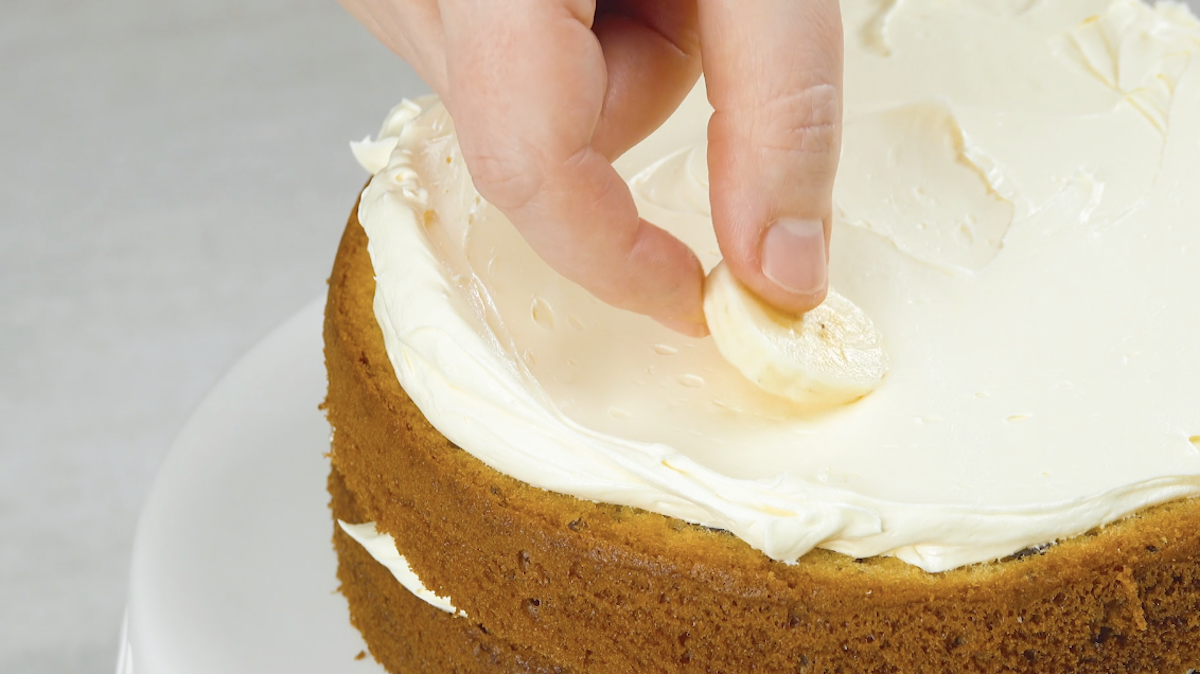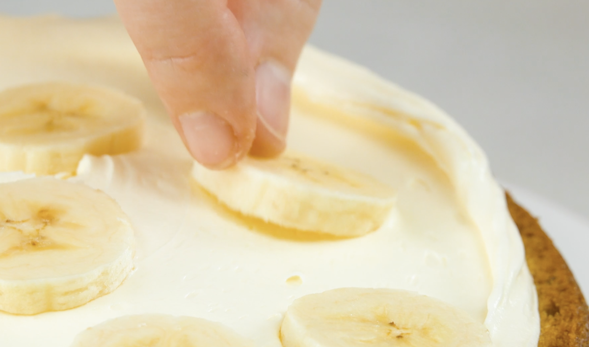 6. Schneide nun die Oberseite vom zweiten Kuchenboden ab und setze diesen auf die Bananenscheiben. Verteile dann wieder Karamellsoße, Buttercreme und Bananenscheiben darauf.