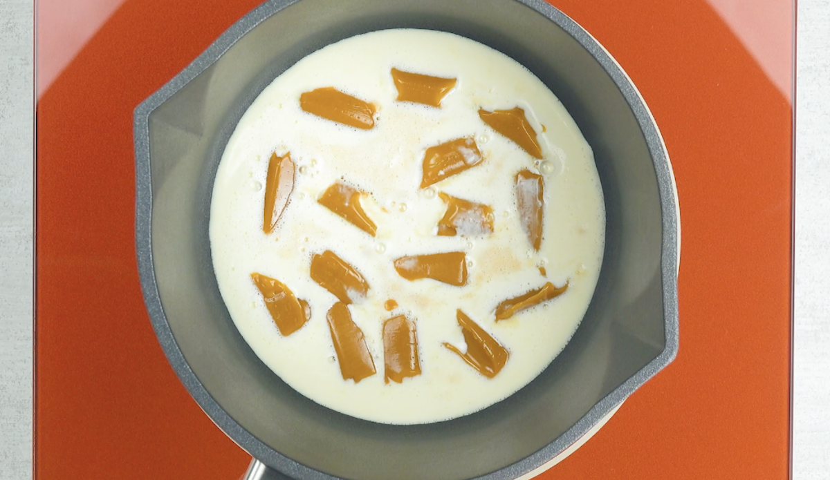 3. Gib Karamellbonbons in einen Topf und füge Sahne hinzu. Erwärme alles bei mittlerer Hitze so lange, bis sich alles miteinander verbunden hat. Nimm die Soße vom Herd und lasse sie abkühlen.