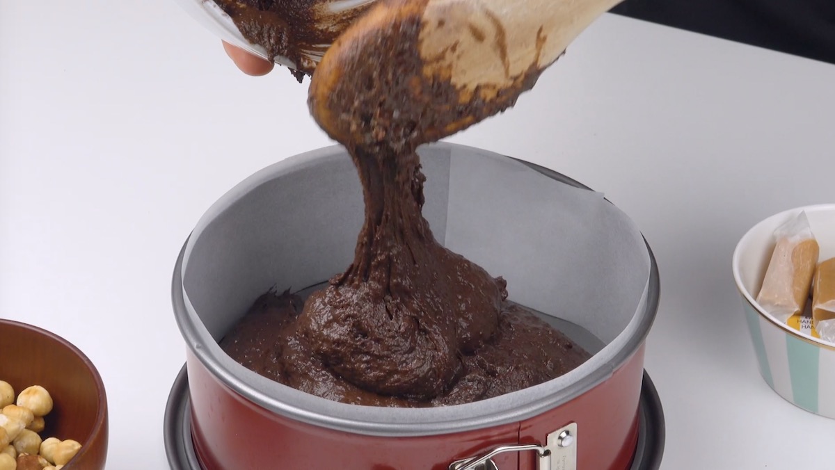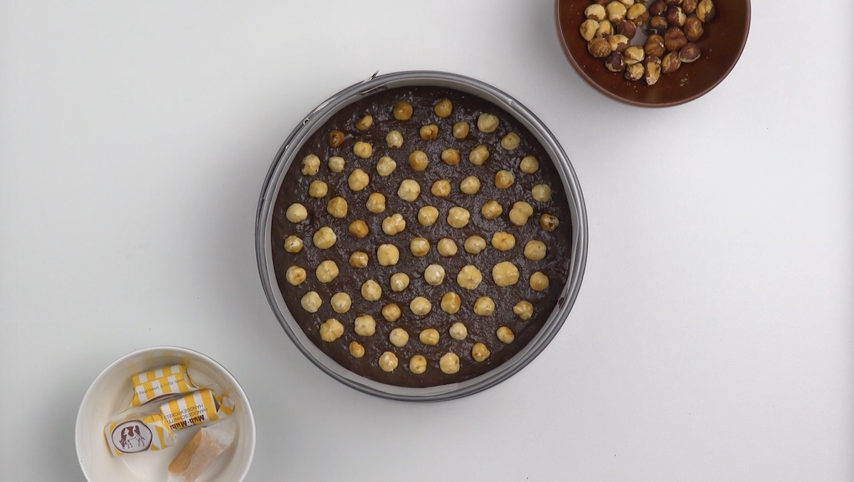 3.) Verteile nun die Haselnüsse oben auf dem Teig. Backe den Kuchen anschließend für 45 Minuten bei 160 °C im Umluft-Modus. Lass ihn danach vollständig in der Form abkühlen.
