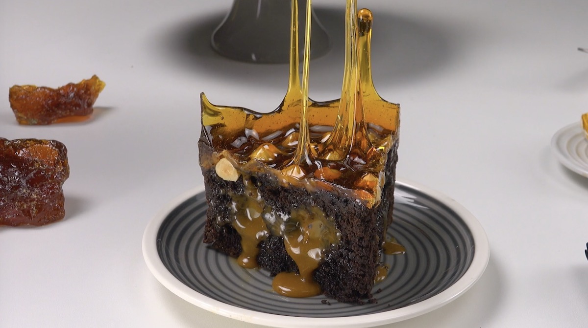 5.) Drehe nun die Springform um. Da das Karamell zähflüssig geworden ist, „fällt“ es nun langsam senkrecht herunter. Warte, bis das Karamell vollständig erstarrt ist, und drehe die Form dann wieder herum. Bei Bedarf kannst du die Spitzen noch mit einer Schere abschneiden.