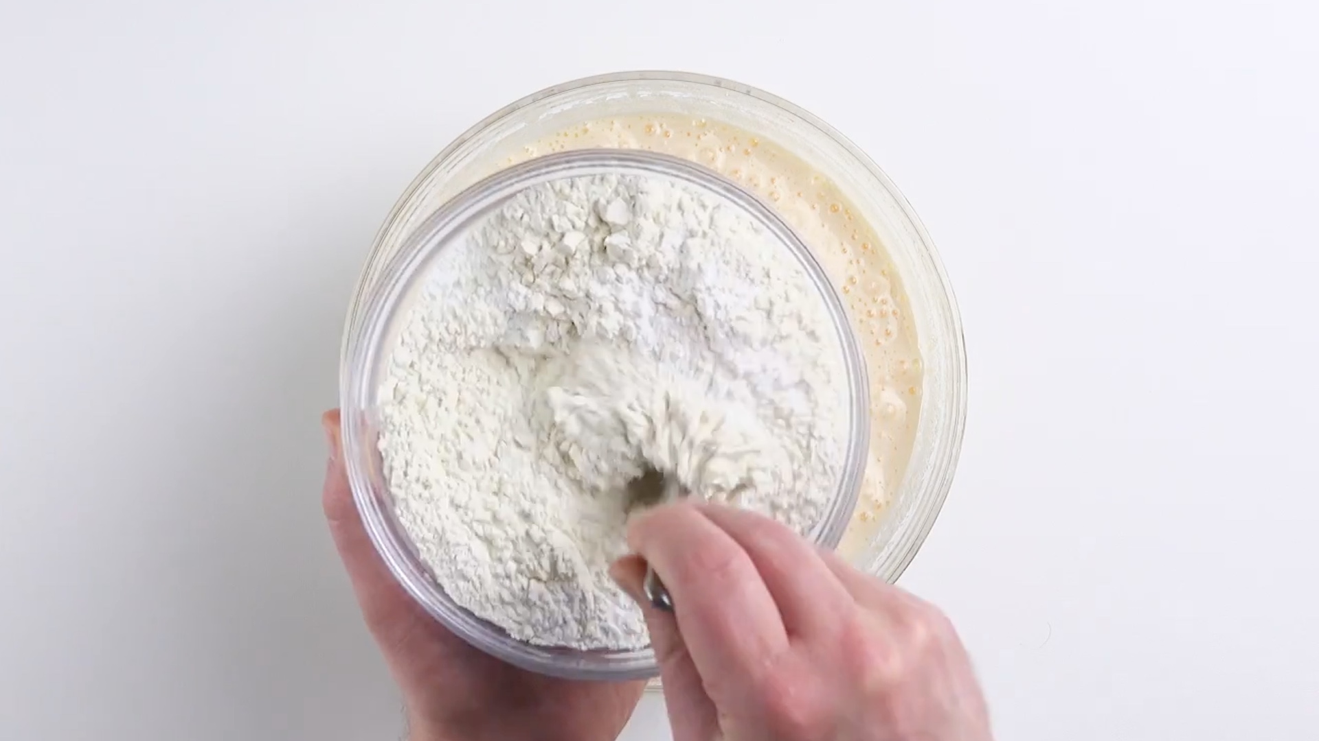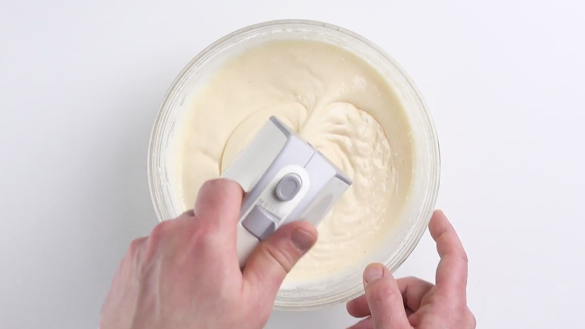 2.) Mische Mehl und Backpulver, bevor du beides mit 400 Gramm Crème fraîche zum Teig gibst und diesen mischst. Teile den Teig in zwei gleich große Portionen und arbeite in eine davon Kakao ein.