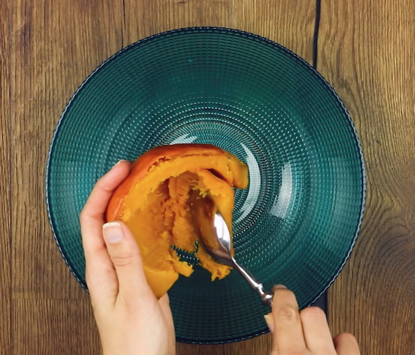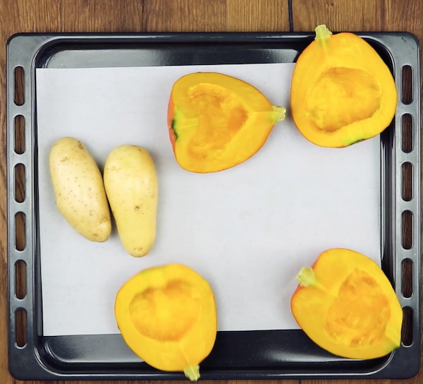 1.) Viertel den ungeschälten Kürbis und gib ihn mitsamt den ebenfalls ungeschälten Kartoffeln für 60 Minuten bei 160 °C in den Ofen.