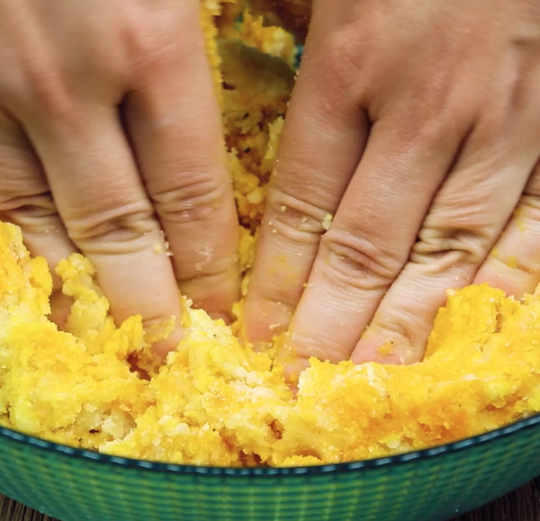 3.) Zerdrücke Kartoffeln und Kürbis in einer Schale und vermische sie zu einer gleichmäßigen Masse. Füge alle übrigen Zutaten hinzu und verarbeite die Masse zu einem glatten Teig.