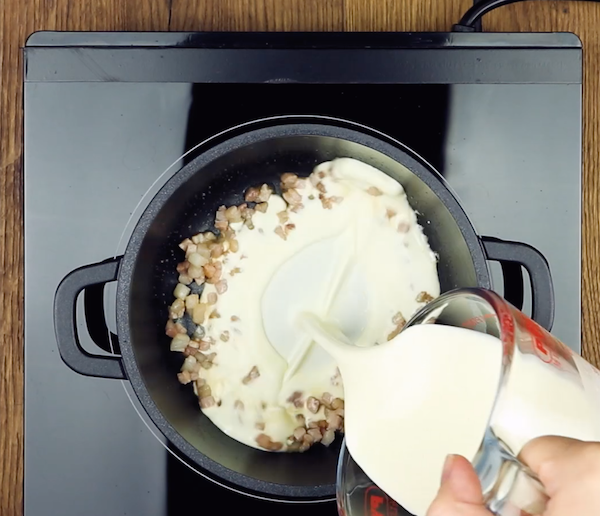 6.) Für die Soße brätst du die Schinkenwürfel in einer Pfanne an. Füge dann die Sahne hinzu und lasse sie so lange einkochen, bis sich die Menge um die Hälfte reduziert hat.