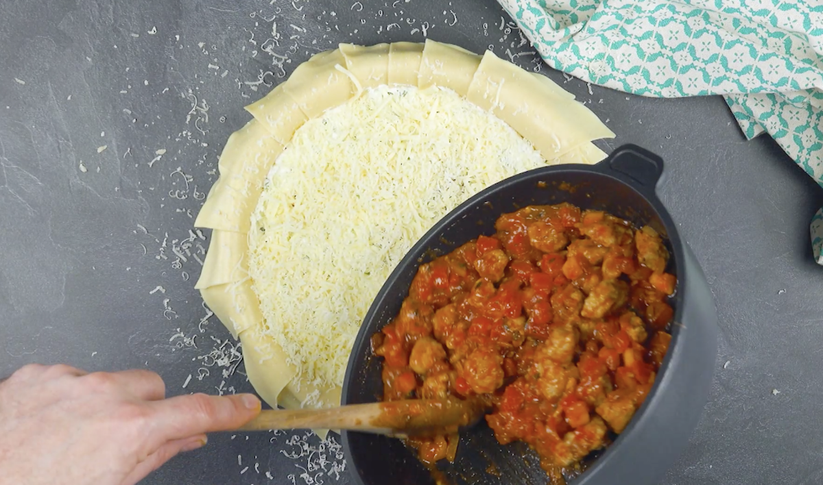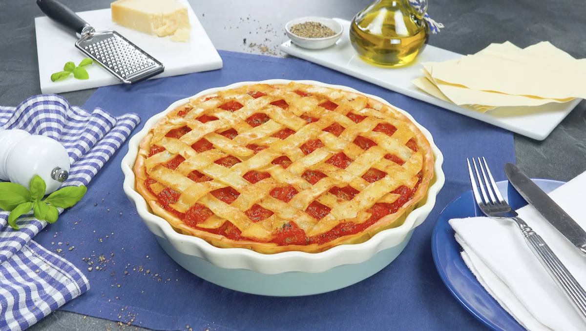 Pfiffige Idee mit dem Nudelgitter, nicht wahr? Dieser herzhafte Kuchen ist eine tolle Alternative zur herkömmlichen Lasagne. Prädikat: unbedingt ausprobieren.